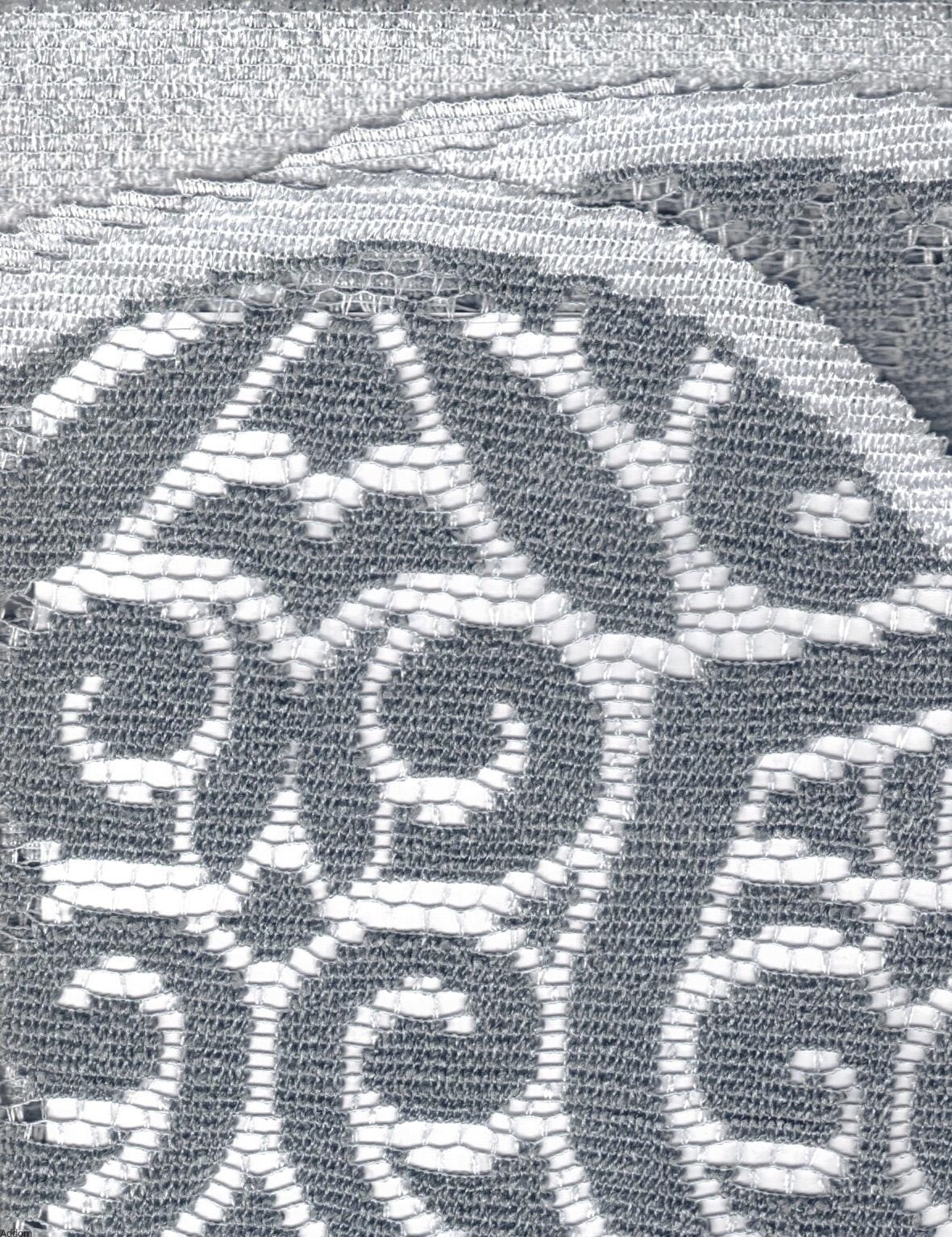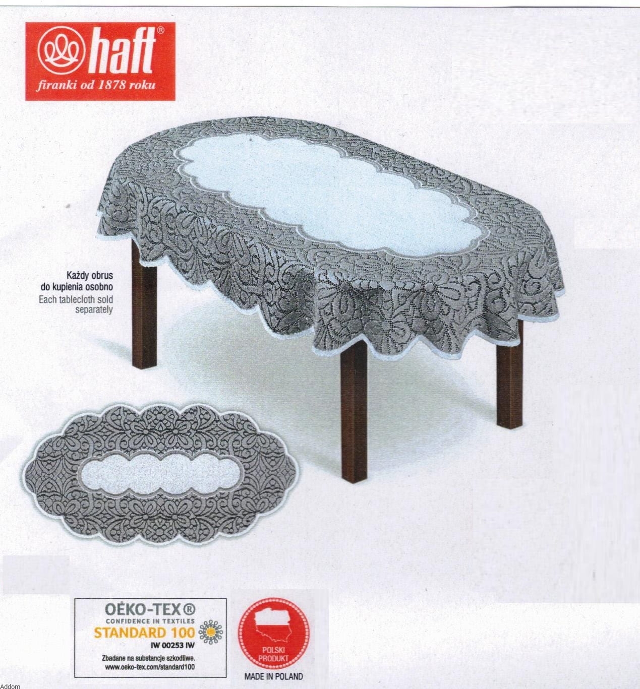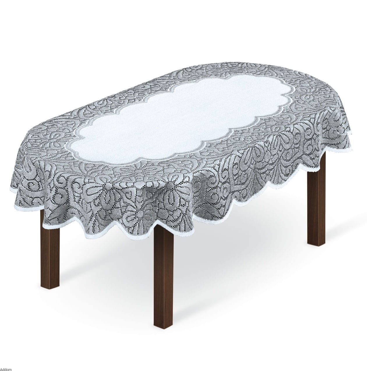 Rzędy kwiatów naokoło pełnego środka oddzielone są od siebie przejrzystym ażurem, który wygląda wyjątkowo atrakcyjnie w przypadku białego lub srebrnego blatu, który będzie prześwitywał przez ażur. Kształt obrusów jest owalny, produkcja kaliska. Widoczny na zdjęciach bieżnik również można u nas nabyć.