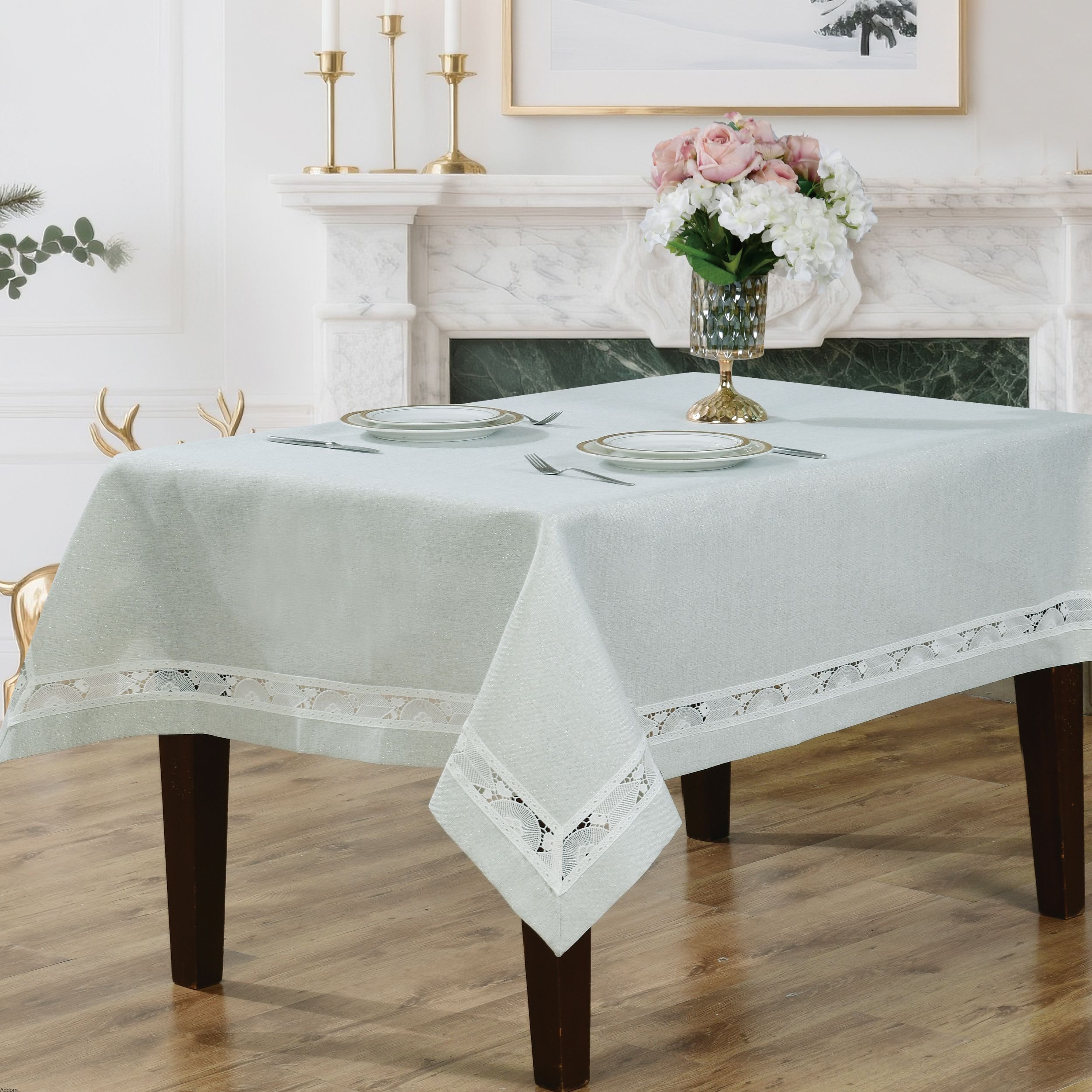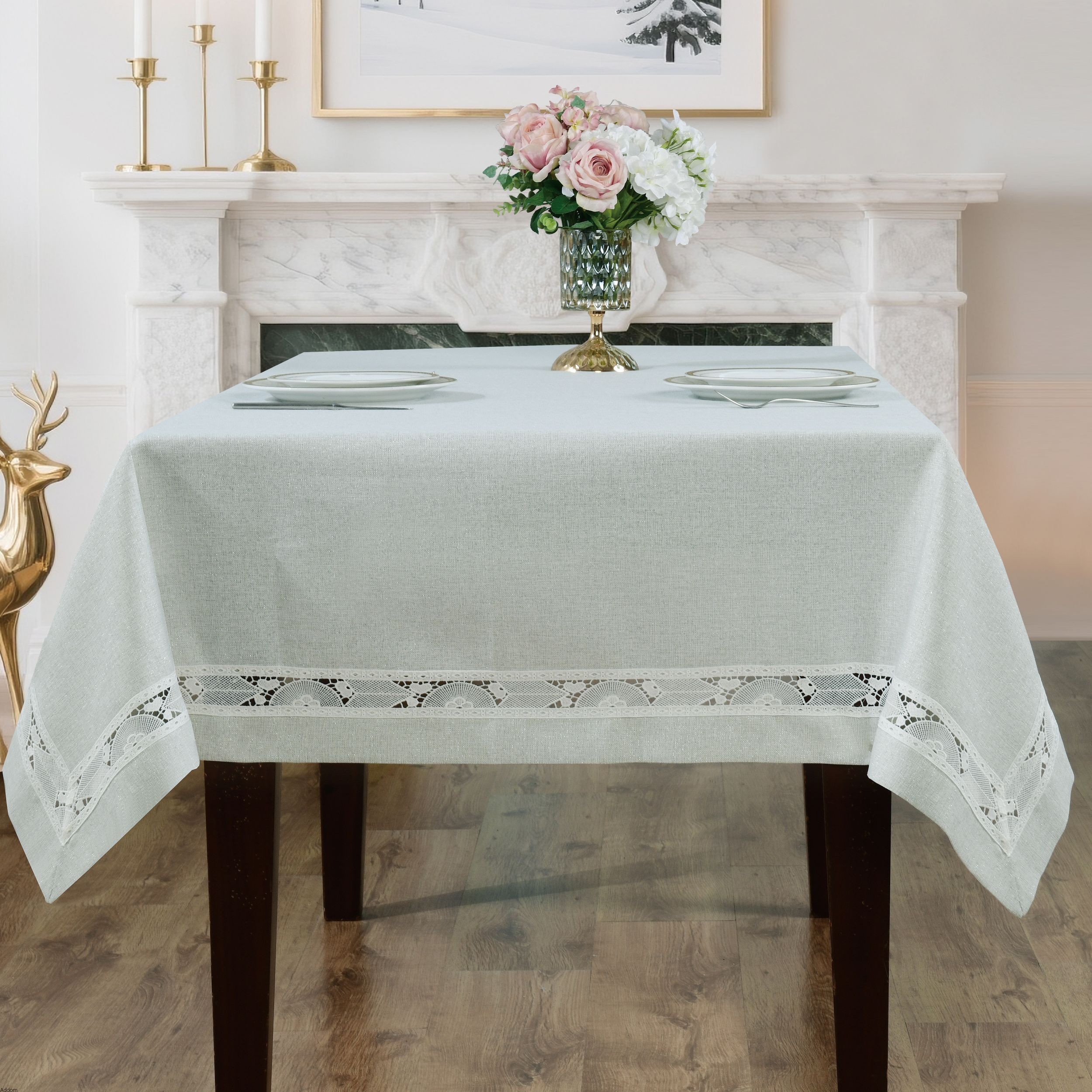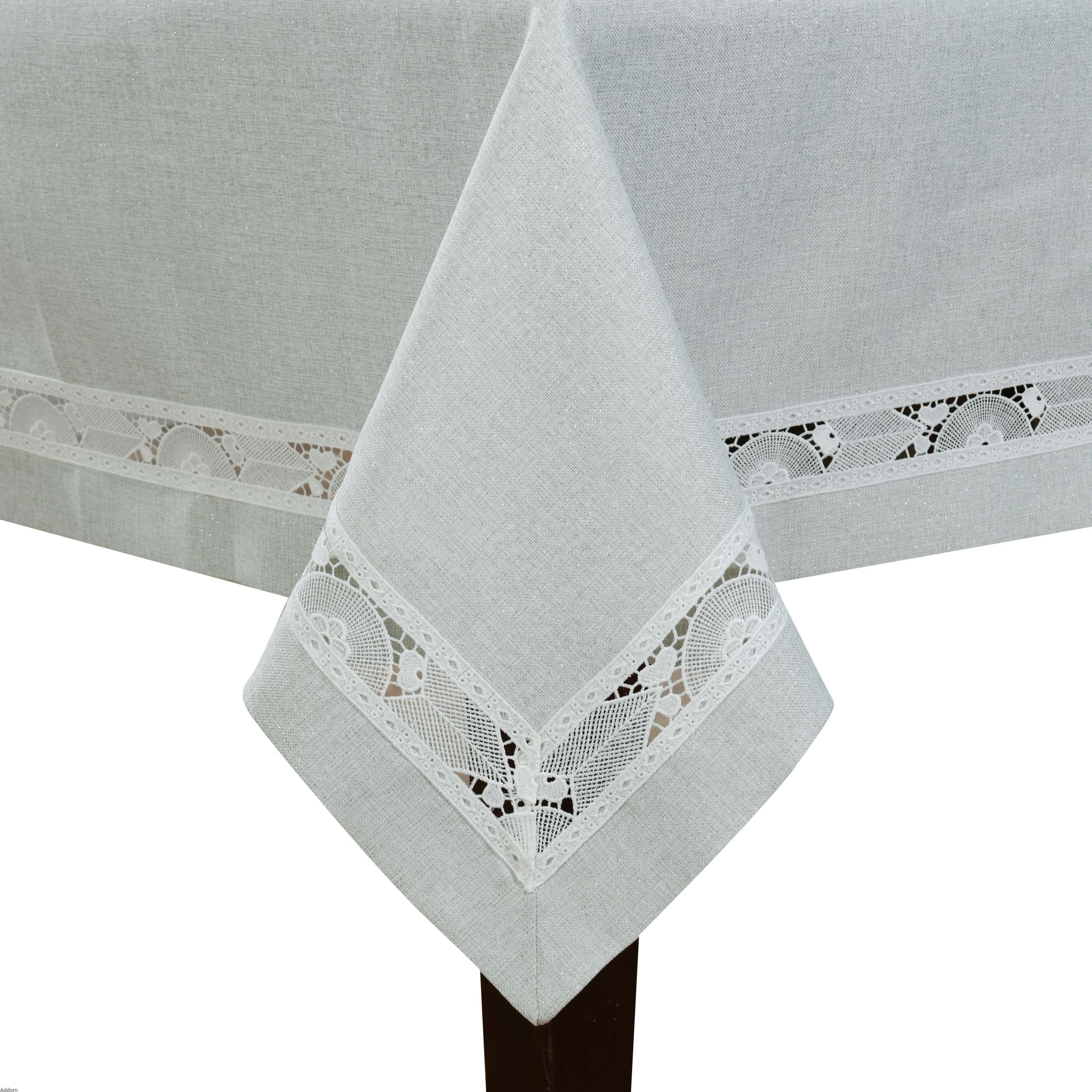 Obrus ten został wyjątkowo starannie uszyty z wysokiej jakości materiałów, które doskonale imitują wygląd i fakturę prawdziwego lnu a srebrne gipiurowe wstawki zlokalizowane wzdłuż obrusu jak i na jego środku dają mu wyszukany wygląd.