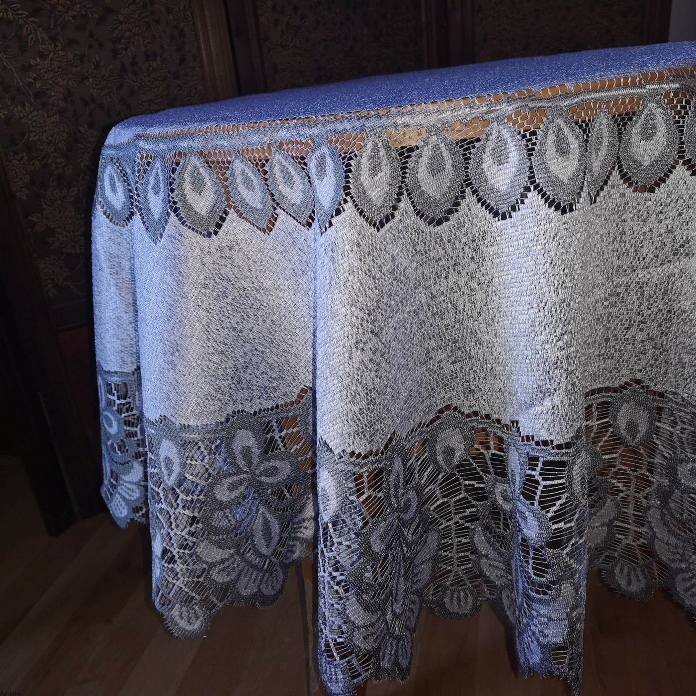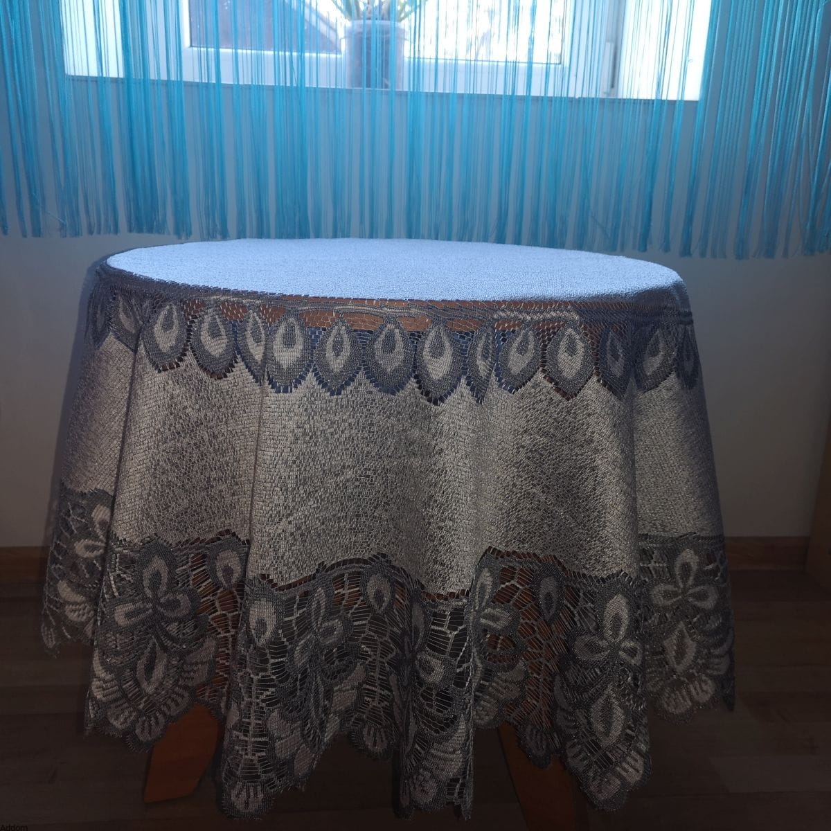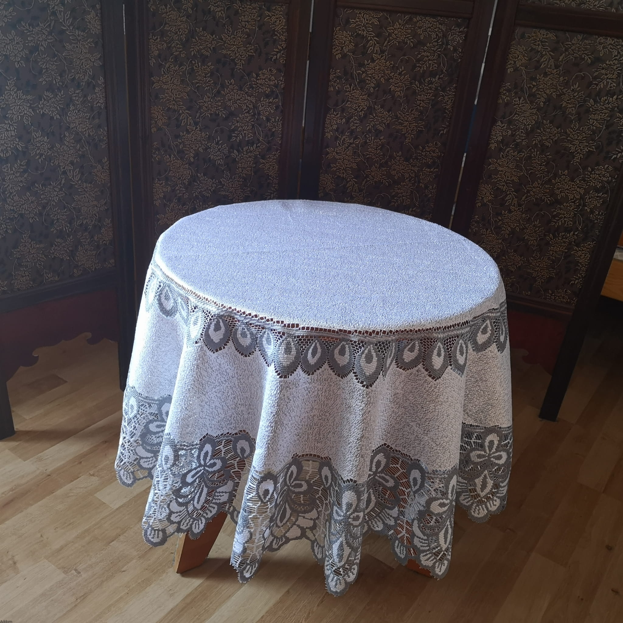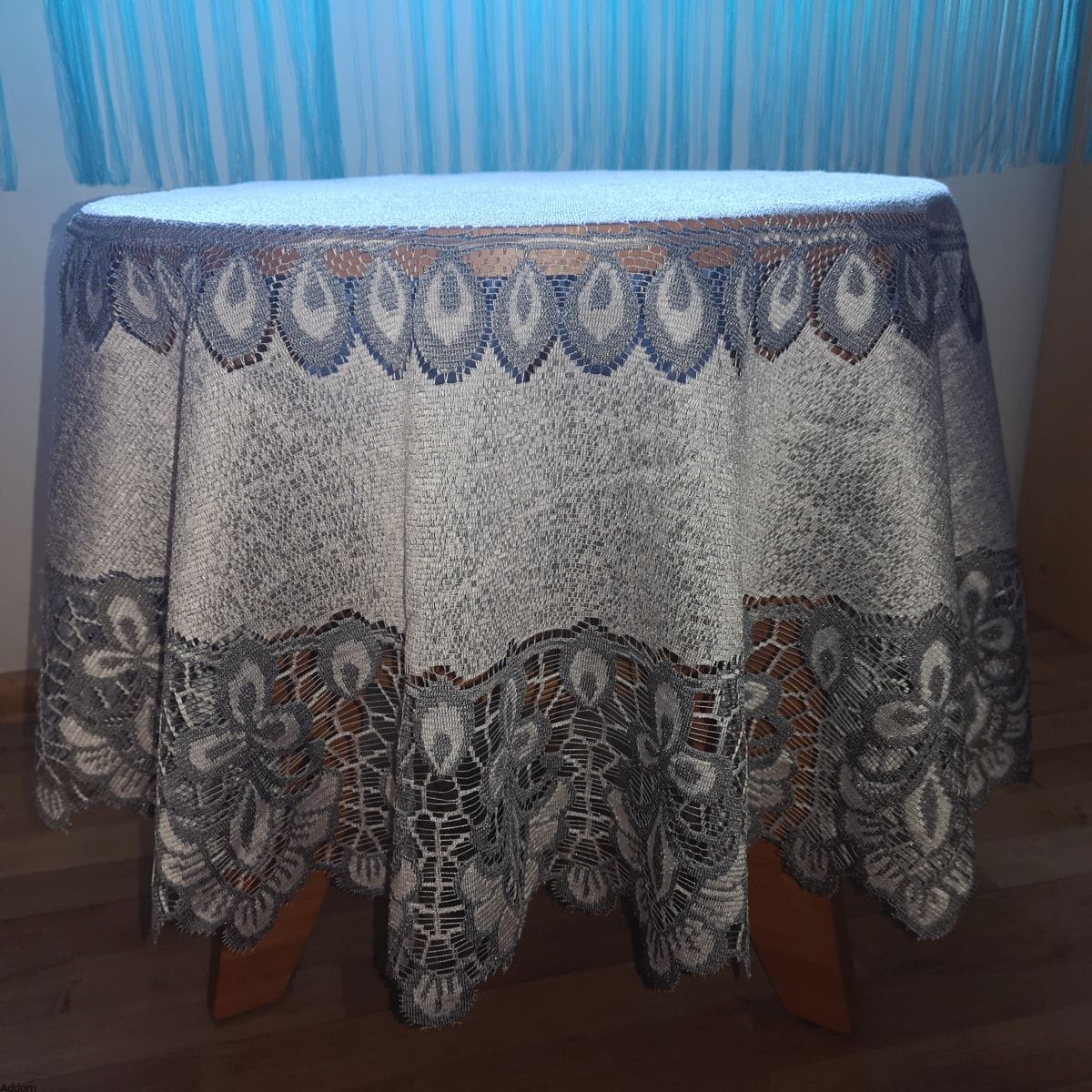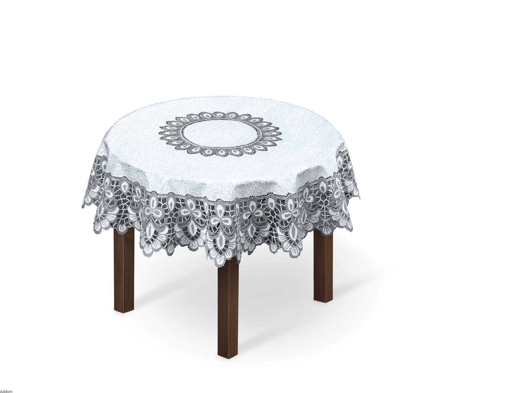 Obrus wykonany z nabłyszczanej przędzy popielatej i białej, przy czym białe tło zawiera dodatek nici popielatej, czyniąc je lekko popielate, ale nadal bardzo jasne i delikatnie błyszczące. Popielata nić tworzy wzory roślinne oraz okrągłą dekorację na środku obrusa, i dość znacząco wyróżnia się z jasnego tła. Średnica tych srebrnych obrusów: 120, 140 i 160 cm.