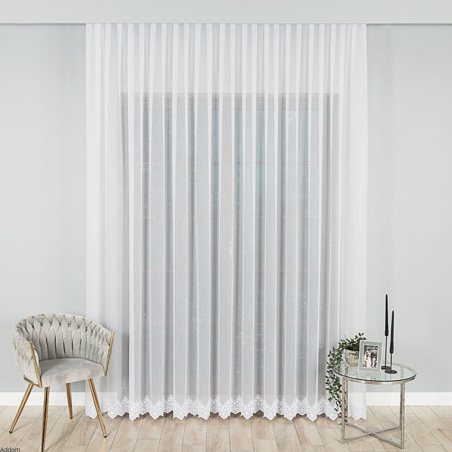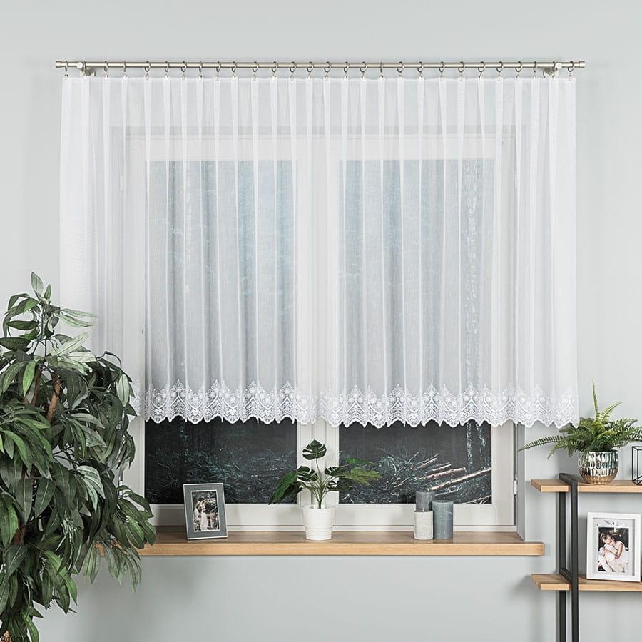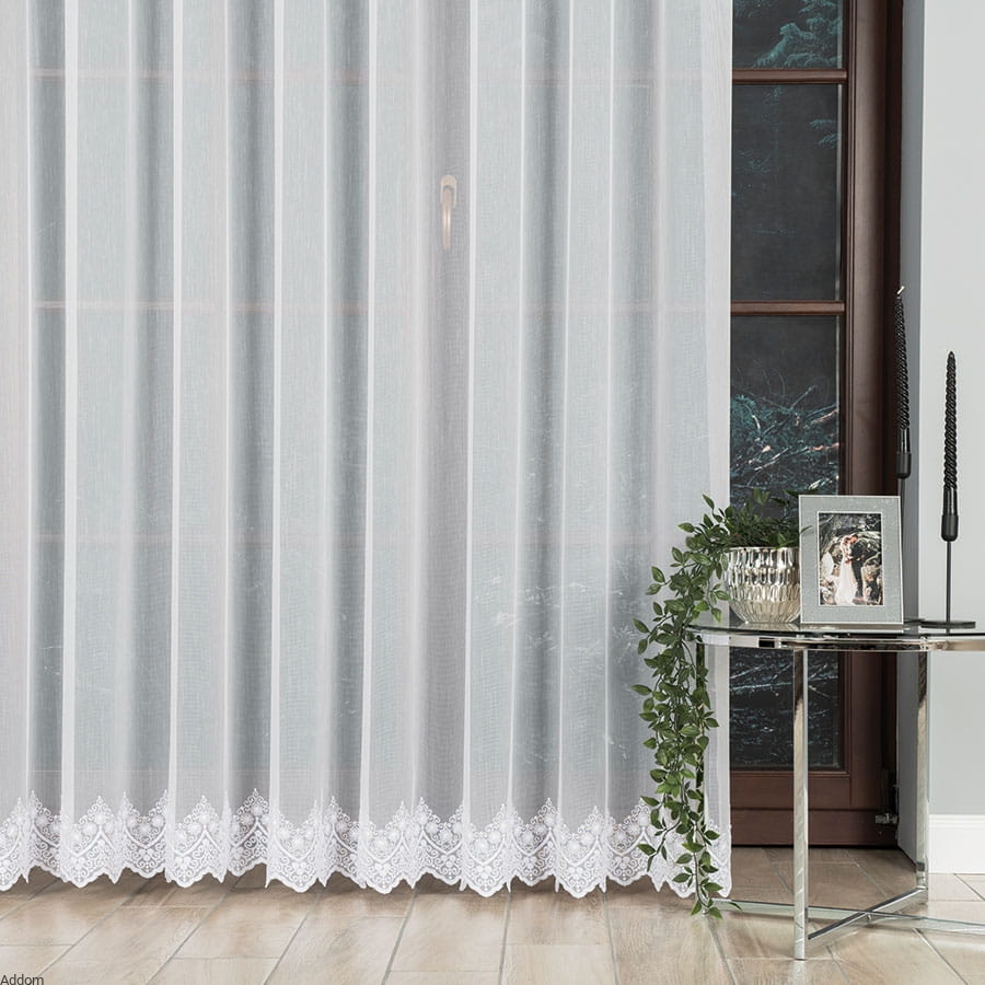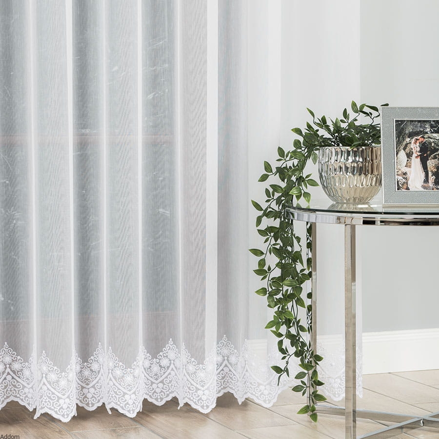 Firany o bardzo stylowym i eleganckim wzorze haftowanym, z pięknym, haftowanym pasem dołem. Dołem stylowy, szeroki, kwiatowo - ornamentowy wzór, który jest grubym haftem, wzbogaconym opalizującą nicią. Opalizująca nić mieni się ciepłymi kolorami, w których dominuje łososiowy odcień. Wysokość firan 120, 160 lub 280 cm. Skracanie firan bardzo proste, wystarczy naciąć i oderwać energicznie niepotrzebną część.