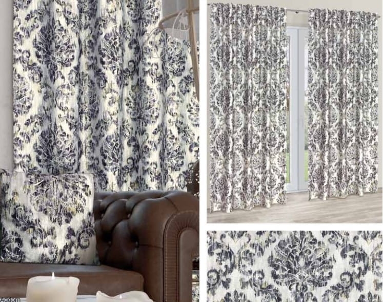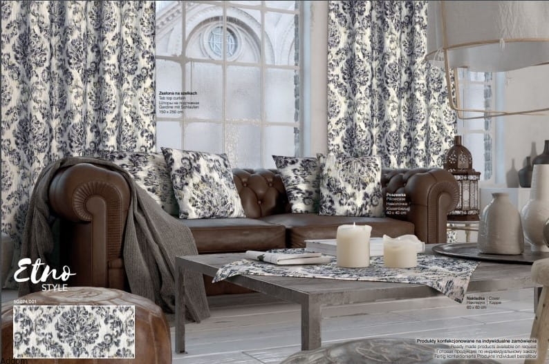 Tkanina w odcieniu bardzo jasnego koloru popielatego, z wzorami stylowymi przecieranymi, w kolorze czerni przechodzącej do koloru popielatego. Wymiary: szerokość 155 cm, wysokość do wyboru. Na zdjęciach pokoju z aranżacją widzicie Państwo wiele dodatków wykonanych z tej samej tkaniny. Posiadamy na stanie także tę tkaninę zasłonową dostępną w metrażu, jeśli więc marzyłby się Państwu taki zestaw dekoracyjny z bieżnikami, obrusami czy poszeweczkami dekoracyjnymi, można dokupić go u nas na metry.