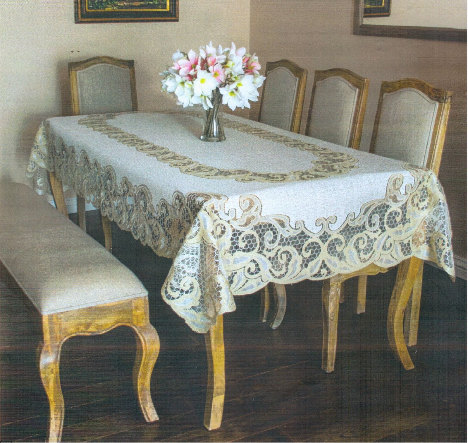 Stylowy obrus z materiału typu żakard, w kolorze srebrnego tła i złotych, stylowych wzorów, połączonych z ażurem o oczkach typu plaster miodu. Obrusy te można z łatwością przekształcić w obrusy owalne - po rozłożeniu ukaże się nam owalny kształt cięcia - przycinając rogi po obrysie owalu obrus stanie się owalny. To bardzo wygodna cecha, gdy nie wiemy, jaki obrus powinniśmy kupić, gdy mamy wątpliwości co do kształtu, bowiem czasem blaty są prostokątne, ale o ściętych kątach, i borykamy się z wyborem. W takiej sytuacji obrus tego typu przychodzi z pomocą - gdy będzie źle leżał, obcinamy mu rogi i stanie się owalny. Nic nie trzeba podszywać, fabryczna linia cięcia zabezpiecza obrus wystarczająco.