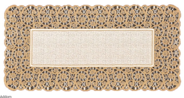 Bieżnik w kolorze beżu i złota, lekko błyszczące odcienie brązów, ze stylowym, szerokim ażurem po obrysie bieżnika. Prostokątny środek jest niewielki w przypadku bieżników najmniejszych, zwiększa się wraz z wymiarami bieżnika. Bardzo elegancki bieżnik lub duża serweta, pasująca do obrusów i serwet z tej serii, które również oferujemy, a umieściliśmy je w zakładce z produktami powiązanymi, która ułatwi Państwu kompletowanie konfekcji stołowej w ramach jednego wzoru.