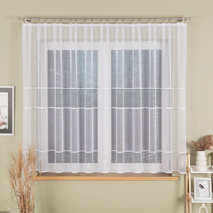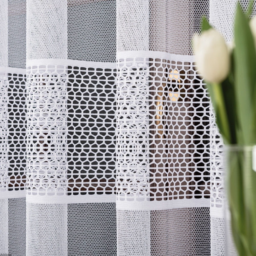 Nieprzeciętnej urody, subtelne firany żakardowe, z 2 w wersjach krótkich lub 3 w wersji na 250 cm, pasami wstawek z przędzy grubszej od tła, w formie krateczki wypełnionej wzorkiem geometrycznym, o wyglądzie gipiury, który jest koronką o prostolinijnym kształcie oczek heksagramu.