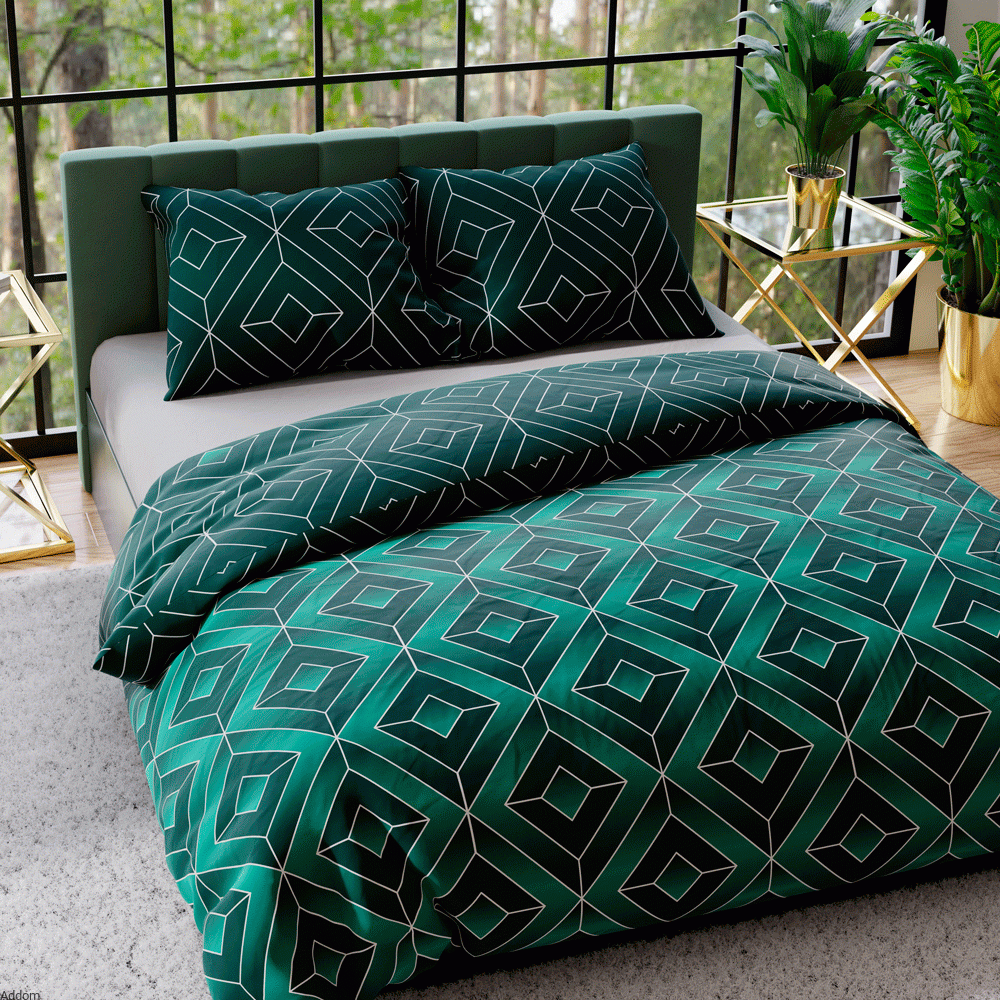 Komplet pościeli w kolorze pięknej, szmaragdowej zieleni, o wzorze przypominającym wnętrze kryształu, może też kojarzyć się z głębią trójwymiarowej kraty. Pościel zawiera 2 główne odcienie zieleni, butelkową i 2-3 tony jaśniejszą zieleń, tworzącą refleksy. Satyna bawełniana użyta w pościeli jest miękka, jedwabista i nie trzeba jej prasować. Z obu stron marmurkowy wzorek. Rozmiary: 160x200 i 200x220.