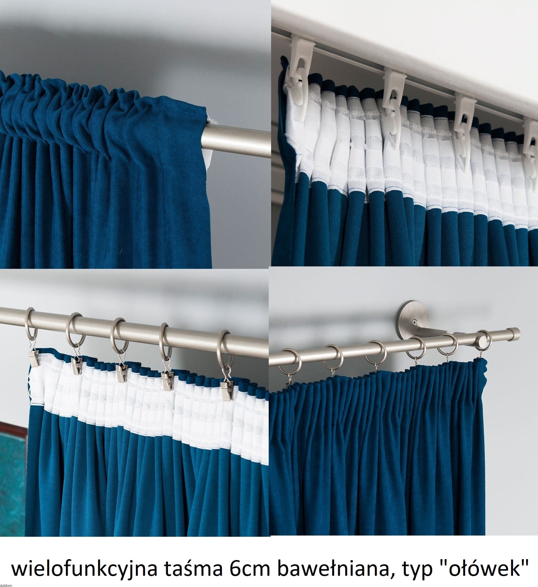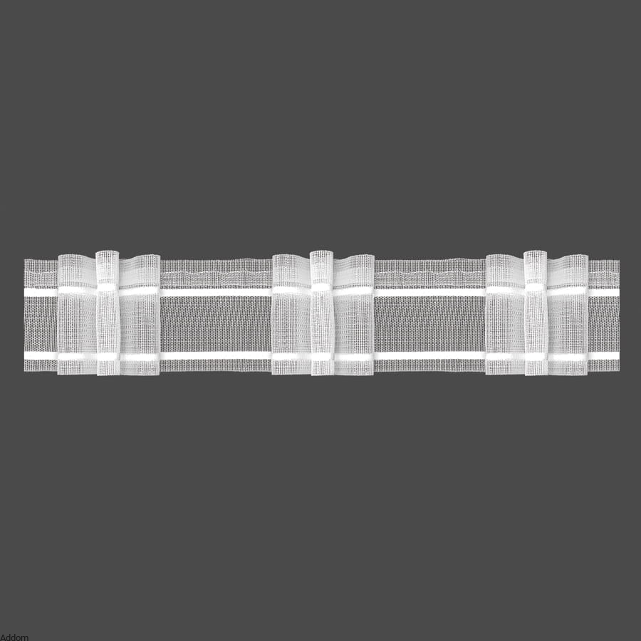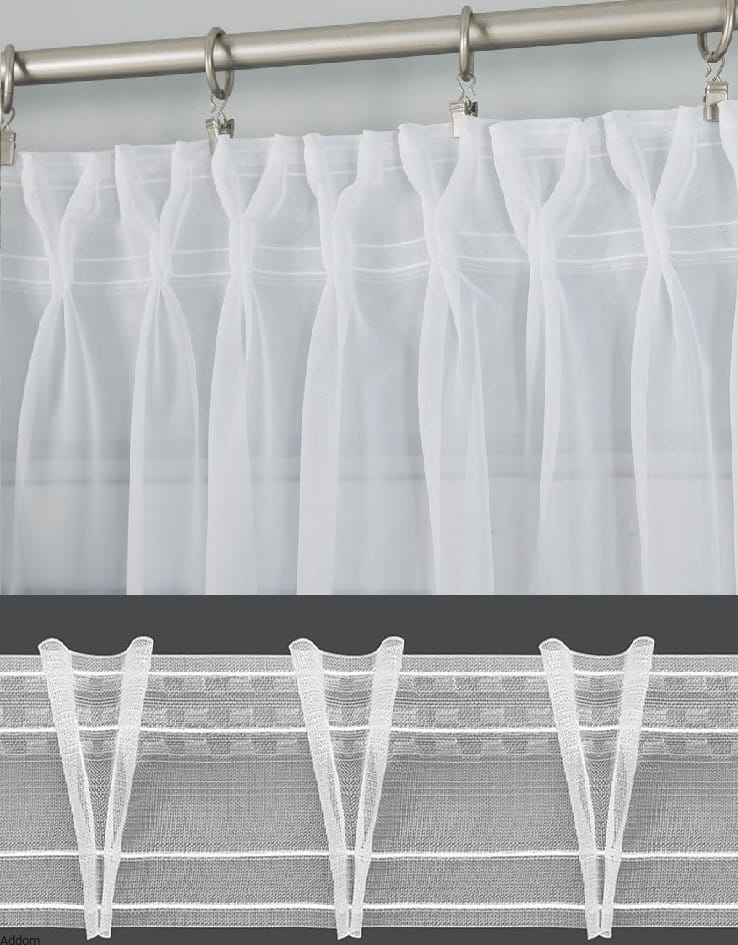 Taśma równomiernie marszcząca "ołówek" - polecana jest do firan wzorzystych aby nie dodawać za wiele zdobień do i tak bogatych firan, najlepiej też pasuje do wzorów typu pasy. Marszczy w stosunku 1:2 lub w wersji uniwersalnej pozwala na dowolne zmarszczenie. W przypadku wyboru wersji 1:2 należy kupić 100% więcej materiału, niż długość karnisza, w przypadku uniwersalnej można pozwolić sobie na dowolne marszczenie. Na zdjęciu poniżej taśma bawełniana o pionowym marszczeniu uniwersalna szerokości 6 cm oraz sposoby jej zastosowania.