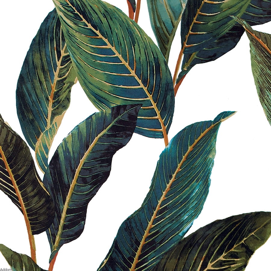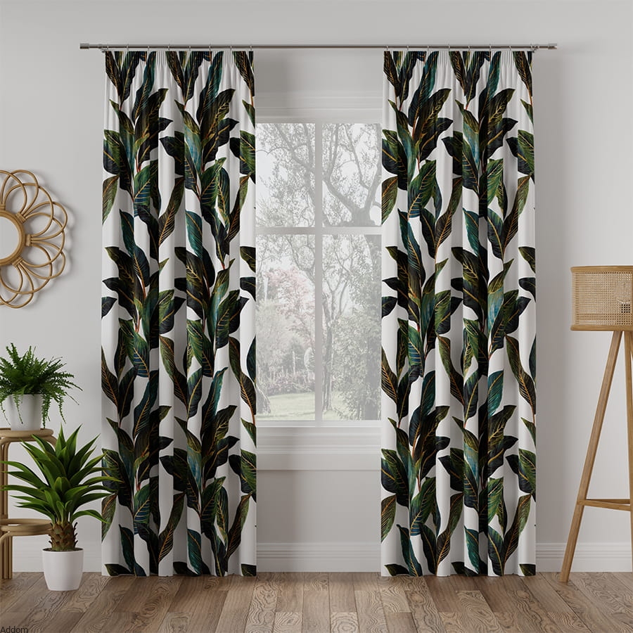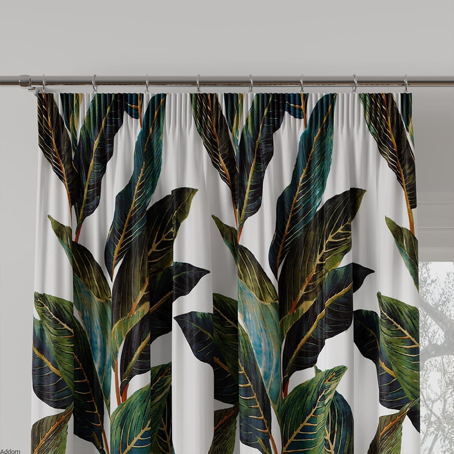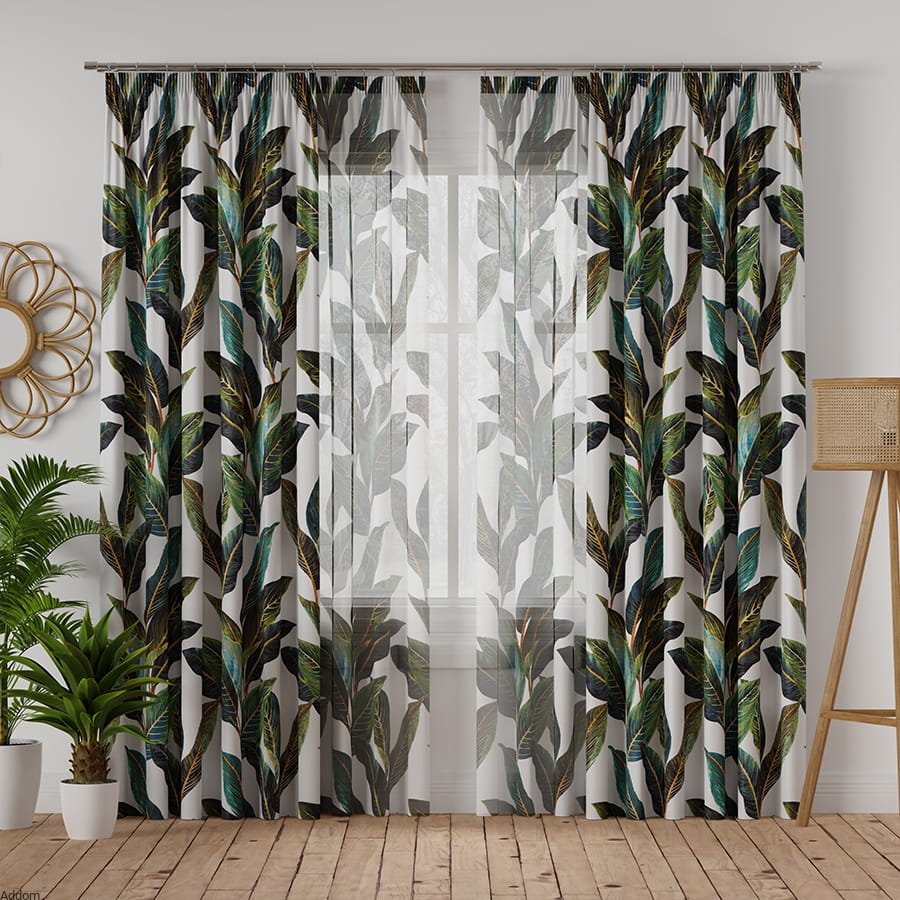 Tkanina dekoracyjna typu black out, w kolorze białym, w olbrzymie liście o żółtym unerwieniu. Tkanina bardzo miła w dotyku, z nadrukiem z jednej strony, który jest bardzo precyzyjny i wyraźny. Materiał ma 154 cm szerokości, a brzegi nie wymagają obszywania. Ten sam wzór znajdziecie w naszym sklepie internetowym na obrusach, pościeli i poszewkach.
