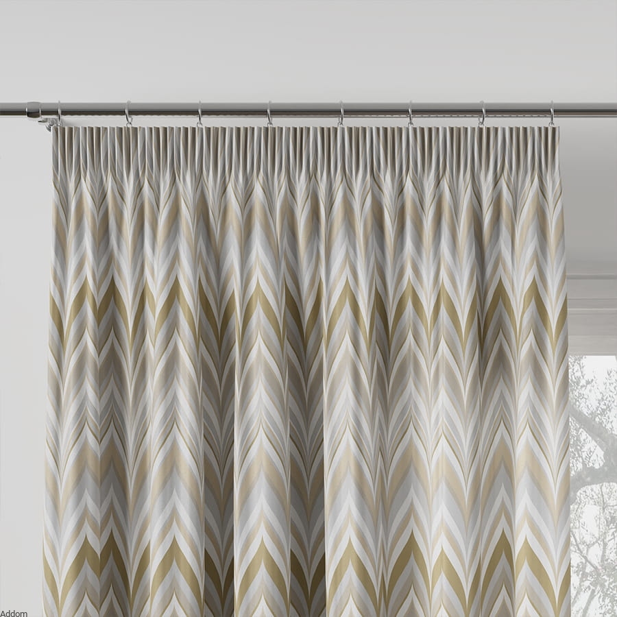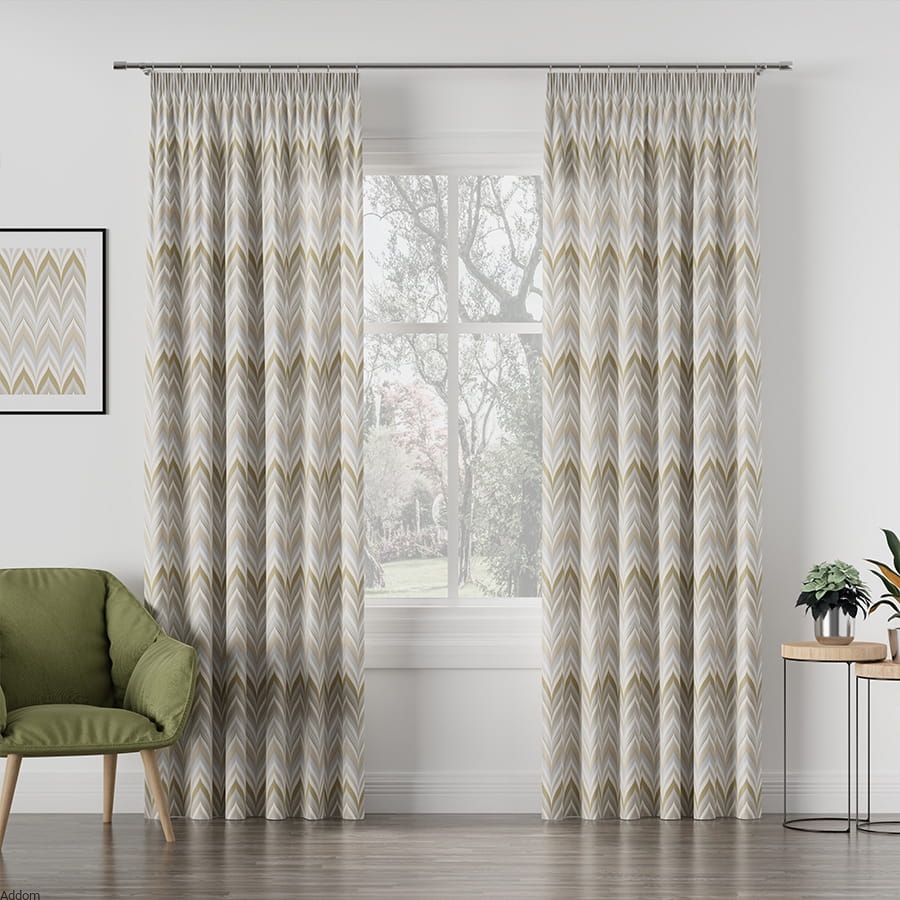 Tkanina zasłonowa o naturalnych, spokojnych kolorach z motywem dekoracyjnym typu zygzak, który regularnie w równych odstępach pokrywa całą tkaninę. Tkanina ma szerokość 140 cm, jest dostępna w wersji złotej i srebrnej. Tkanina jest gruba i w pełni zasłaniająca.