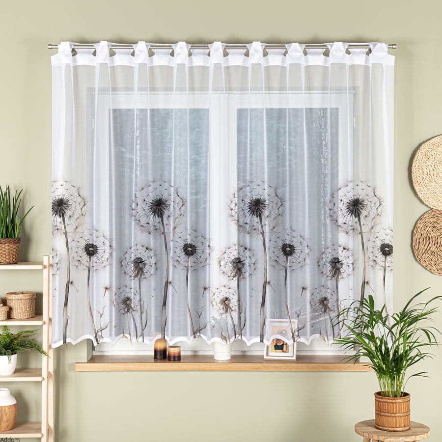 Ożyw swoje wnętrze dzięki tkaninowej krótkiej firanie ozdobionej delikatnym motywem dmuchawców. Ta wyjątkowa dekoracja okienna wprowadza do pomieszczenia atmosferę lekkości i świeżości, idealnie pasując do wnętrz urządzonych w stylu nowoczesnym, skandynawskim lub boho.