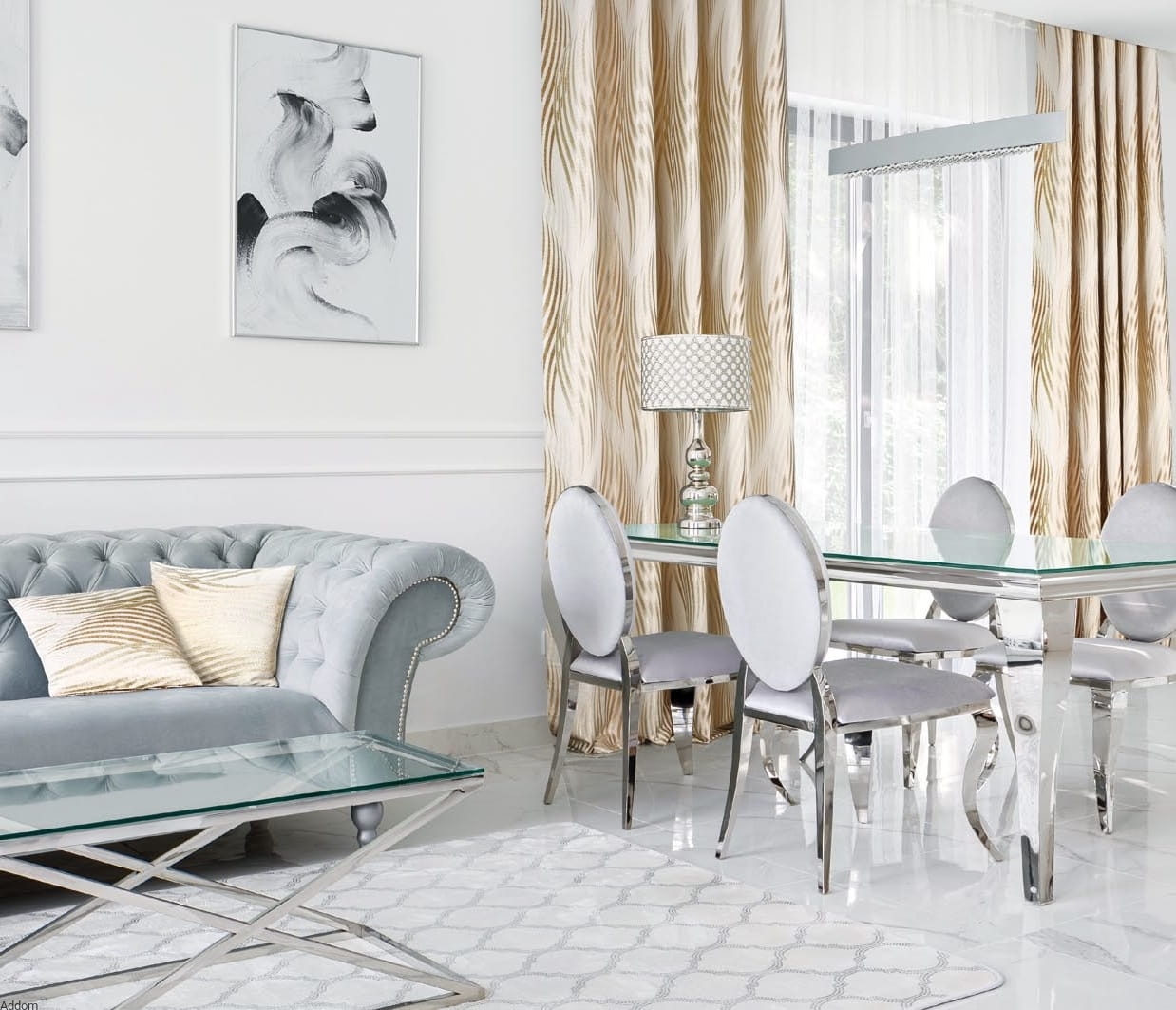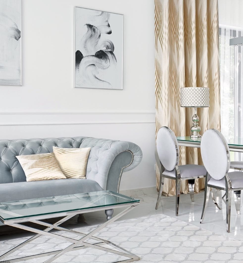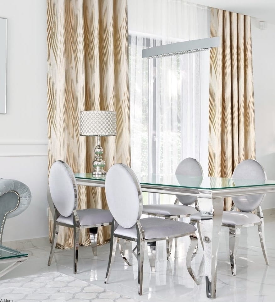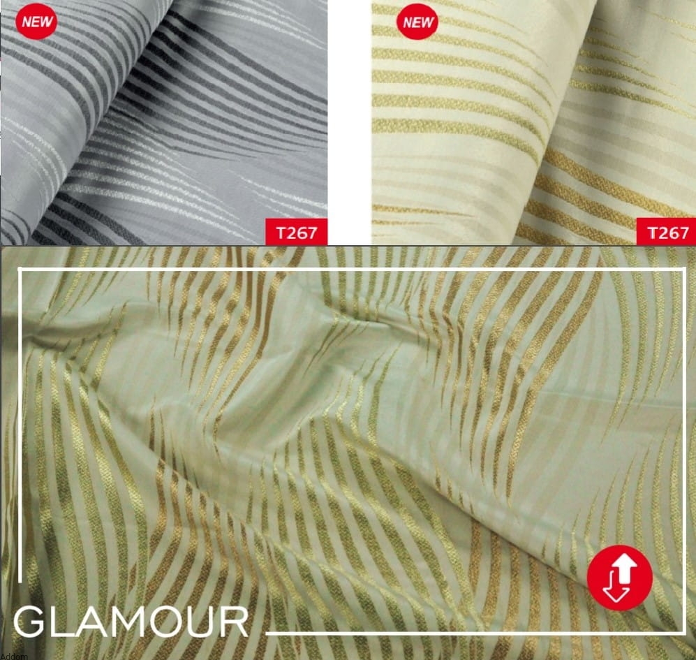 Tkanina dekoracyjna zasłonowa, której tło jest szare lub kremowe, a falowane linowe wzory są złote lub srebrne. Tkanina ta ma szerokość 170cm, pochodzi w kolekcji Glamour firmy Haft, i jest to tkanina w 100% poliestrowa, kryjąca, nieprzejrzysta. Z tej tkaniny są dostępne u nas produkty gotowe, zasłon oraz poszewki, aby je znaleźć wystarczy kliknąć nad niniejszym opisem zakładkę "produkty powiązane".