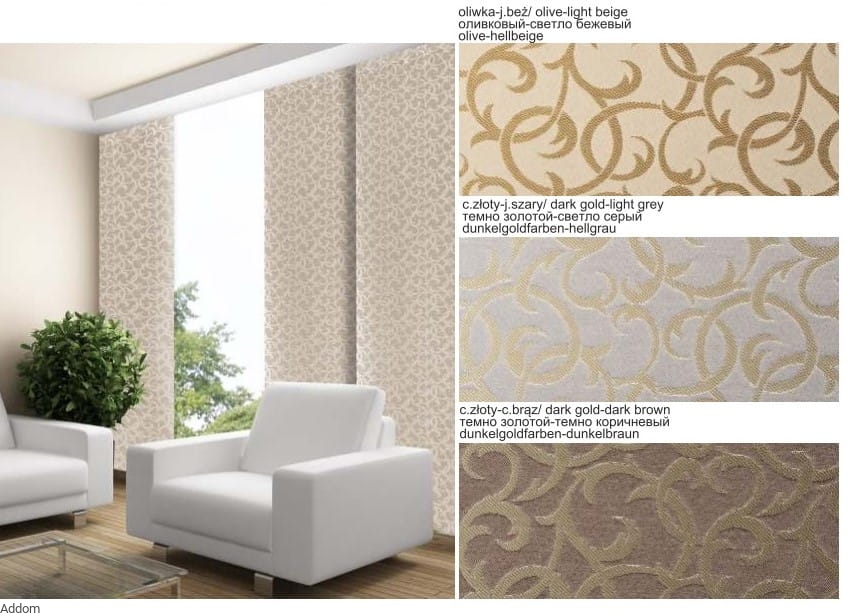 Tkaniny na piękne zasłony o złotych wzorach, z tłem w spokojnych, naturalnych barwach beżu, szarości i brązu, o szerokości 170 cm. Tkaniny te są mają błyszczące wzory, kontrastują one z tłem tkaniny, połyskując złotym odcieniem, lub srebrnym, w przepadku wersji popielatej. Materiał ten pochodzi z kolekcji Górskie Szlaki, inspirowanej naturą gór, dlatego kolorystyka związana jest z tym, co spotkać możemy na górskim szlaku podczas wypoczynku w górach.