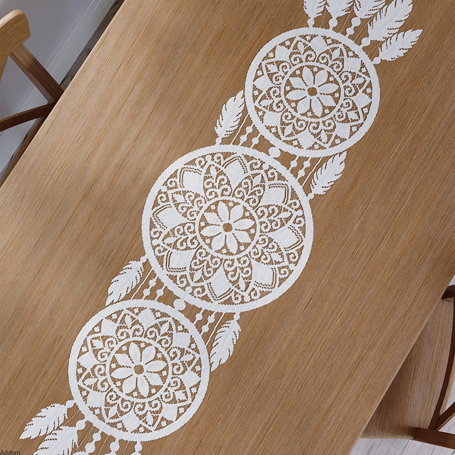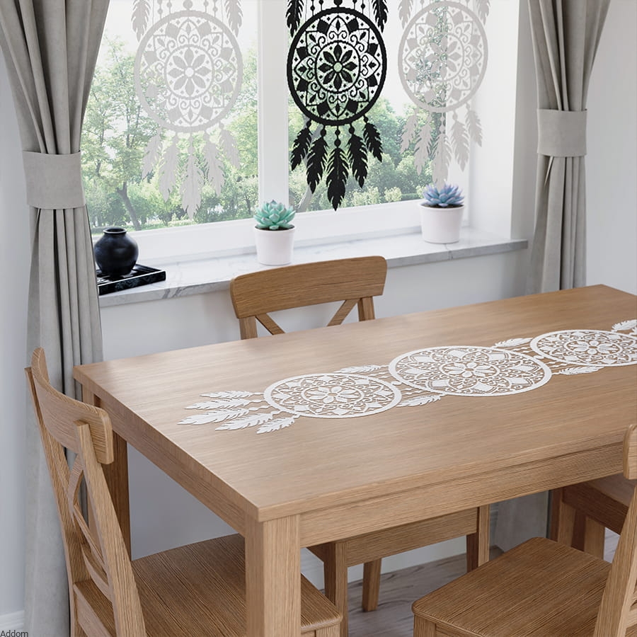 Wycinanki te są wąskie ale długie, najdłuższą wersję oferujemy w rozmiarze 45x225cm, najmniejsze mają wymiary 35x140 cm. Ciekawa jest też ich kolorystyka - od tradycyjnej bieli, przez rustykalny jasny beż, po ekstremalnie czarny. Ten sam wzór wycinanki z mandalami oferujemy jako panele dekoracyjne na okna, znajduje się on także na firanach, które sprzedajemy, dlatego można u nas zakupić całą aranżację ze zdjęć.