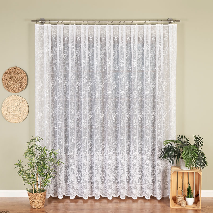 Wzór kwiatowy jest precyzyjnie wykonany, co dodaje żakardowi klasy i szyku, wyglądając z daleka niczym haft. Kwiaty są gęste i większe na dole, zmniejszają się na górze. Wzór jest dość płaski a firana lekka.