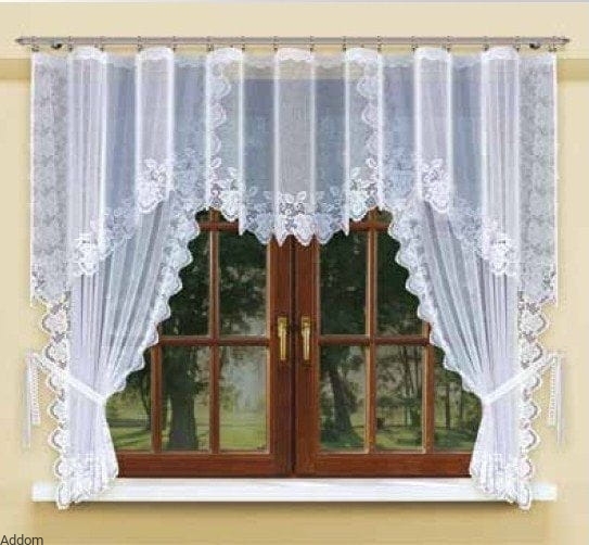 Zasłony są białe, bez wzoru, jednak ich oba boki oraz dół, są wykończone eleganckim ażurem, który pięknie zgra się z obrusem i bieżnikiem, które dokupić można w zakładce "powiązane". Ten sam wzór ażurowy dekoruje dół firany.