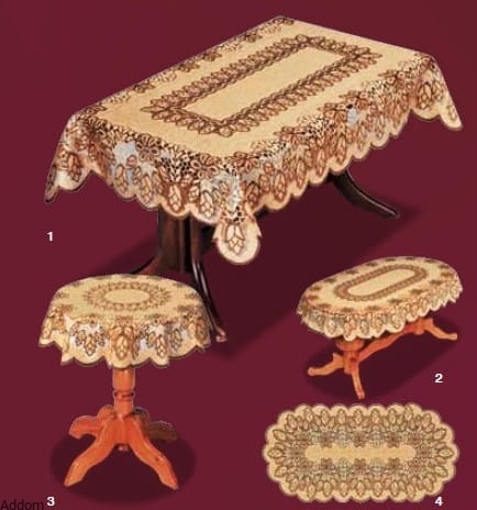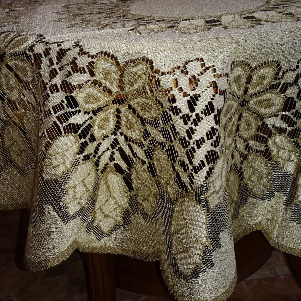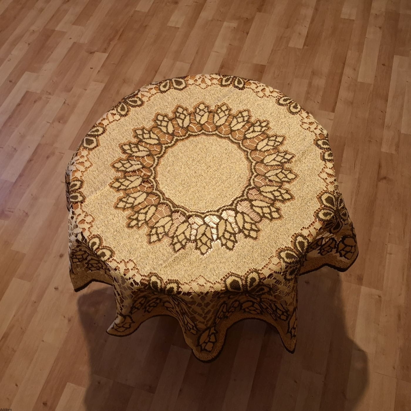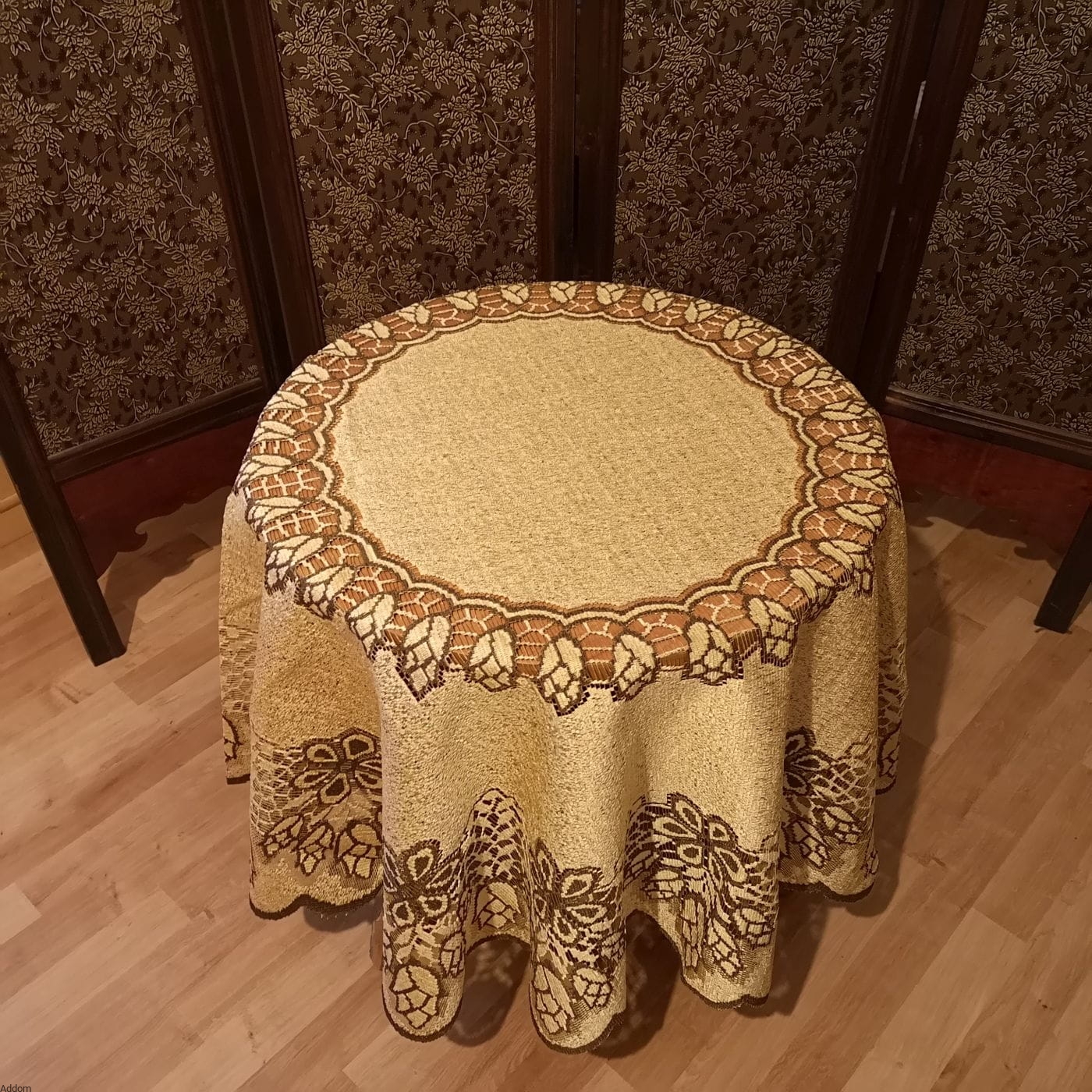 Strojny obrus żakardowy z nici w 2 kolorach, gdzie jeden kolor jest ciemny, a drugi, bazowy, jasny. Wersja ze zdjęcia głównego to wersja brązowa (brunat/brąz), a dostępny jest także kawowy brąz, o ciemniejszym tle, mniej zbliżonym do złotego, bardziej w odcieniu kawowym, natomiast wersja jasna oliwka / ciemna oliwka to kolor oliwkowy, tylko w 2 odcieniach, jaśniejszym i ciemniejszym jednocześnie. Jedyną wersją z jaśniejszym zdobieniem jest wersja oliwka/brunat - ten obrus wygląda cały złoty, ze złotymi zdobieniami, strojny, ale z mniejszym kontrastem. Wzór jest w postaci wiszących w dół pąków, podobnych nieco do kłosa.