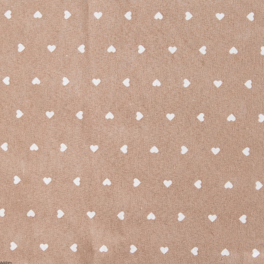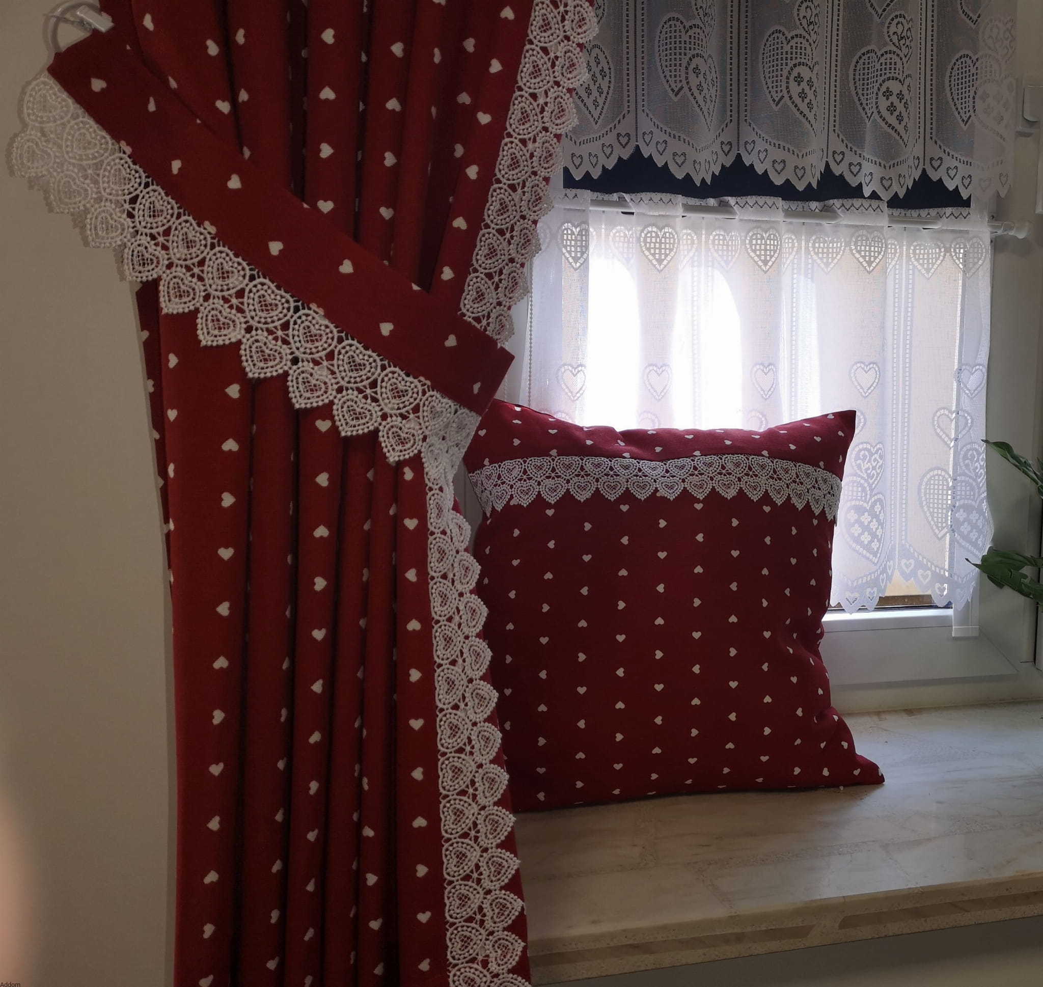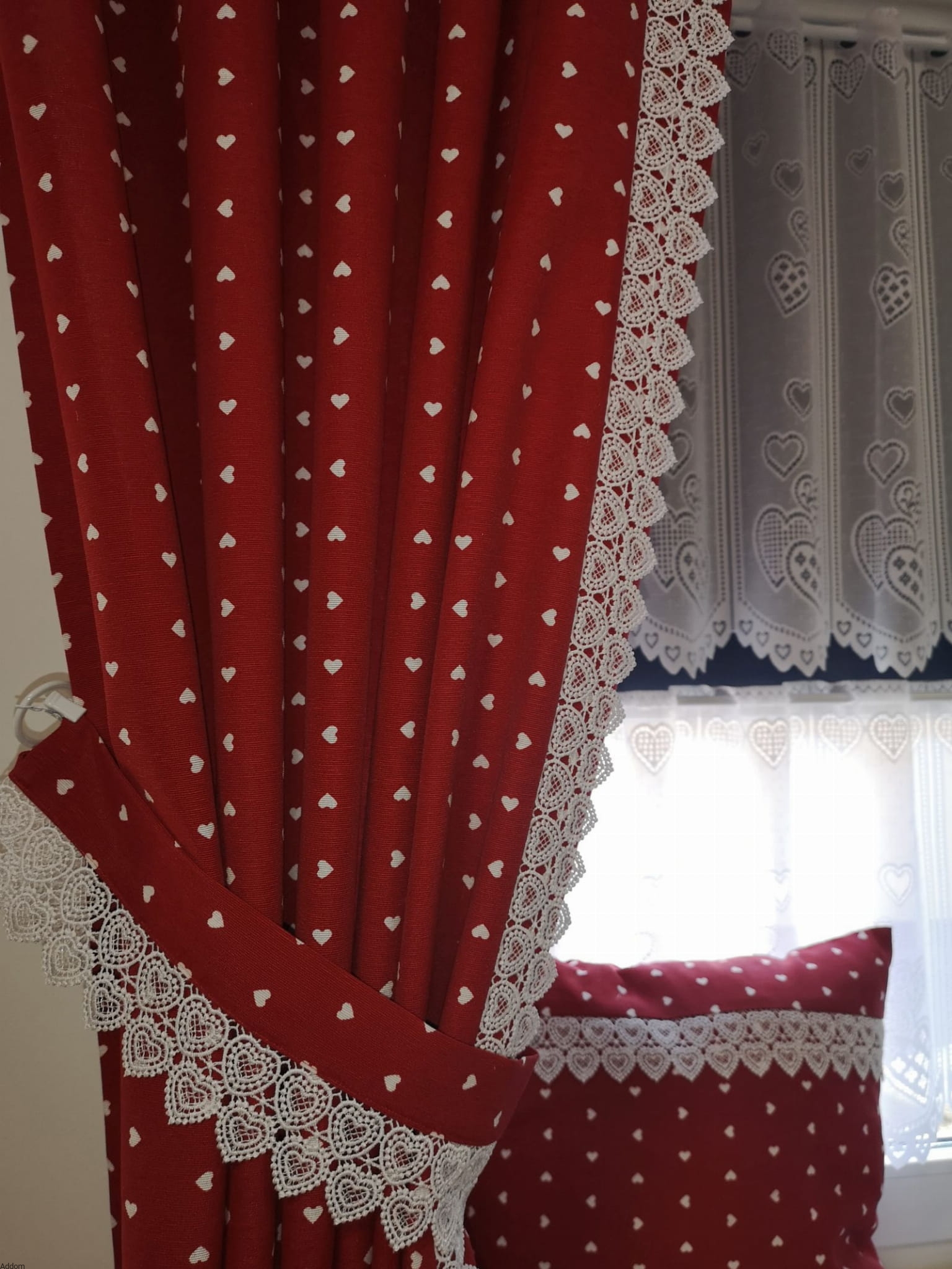 Każda zasłona jest obszyta, a na życzenie możemy również uszyć z tego materiału lambrekin (cena za metr uszytego lambrekinu z gipiurową koronką to 45 zł), obrus i poszewki. Materiał, z którego uszyto zasłonki jest bawełniany, gruby, lekko sztywny, o rustykalnym design. Tło beżowe, wzory to serduszka.
