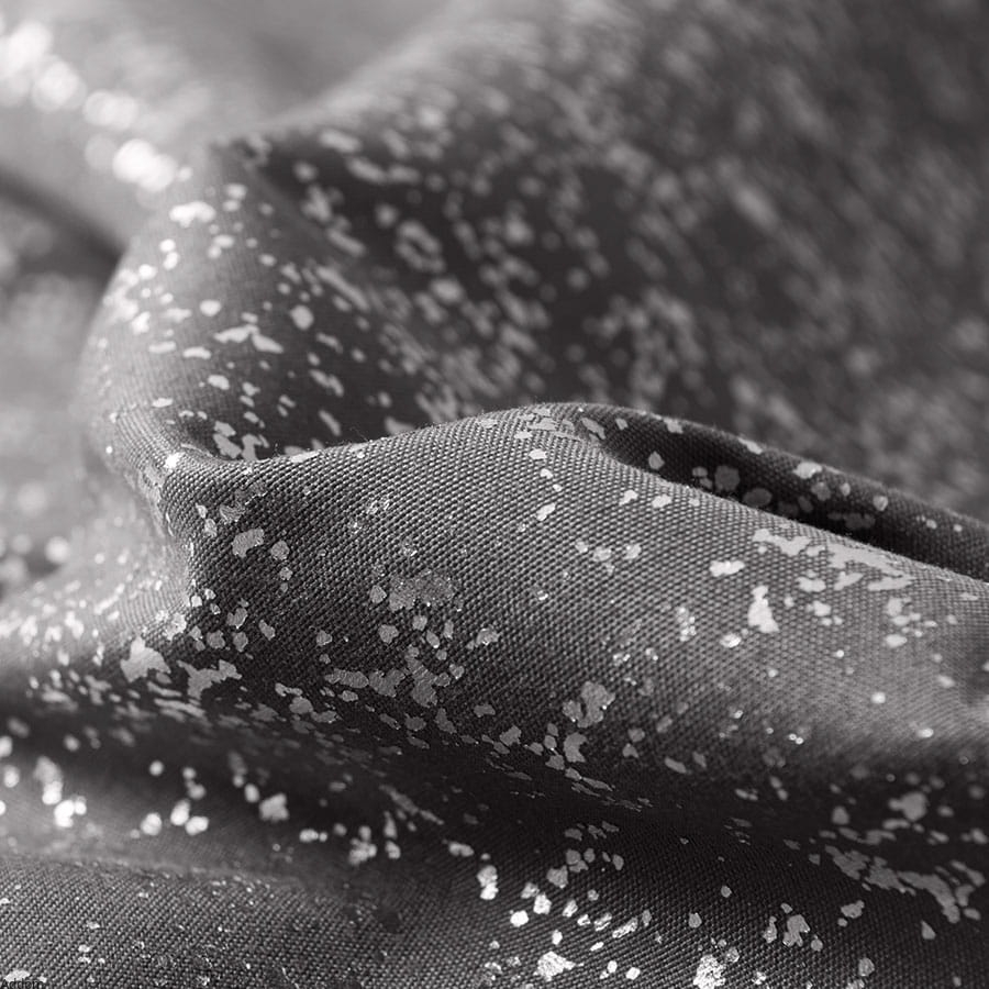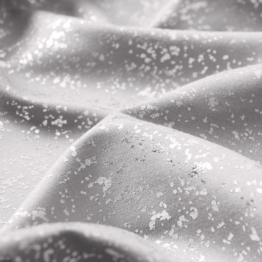 Zasłony jednokolorowe z metalicznym, srebrnym zdobieniem, gotowe do zawieszenia, na taśmie marszczącej tradycyjnej lub taśmie marszczącej z krytymi szelkami, która umożliwia wieszanie nie tylko na żabkach, ale i tunelu. lub taśmy na żabki, która marszczy tak, jak zasłony wiszące na przelotkach, w formie łagodnych fal.