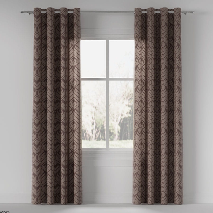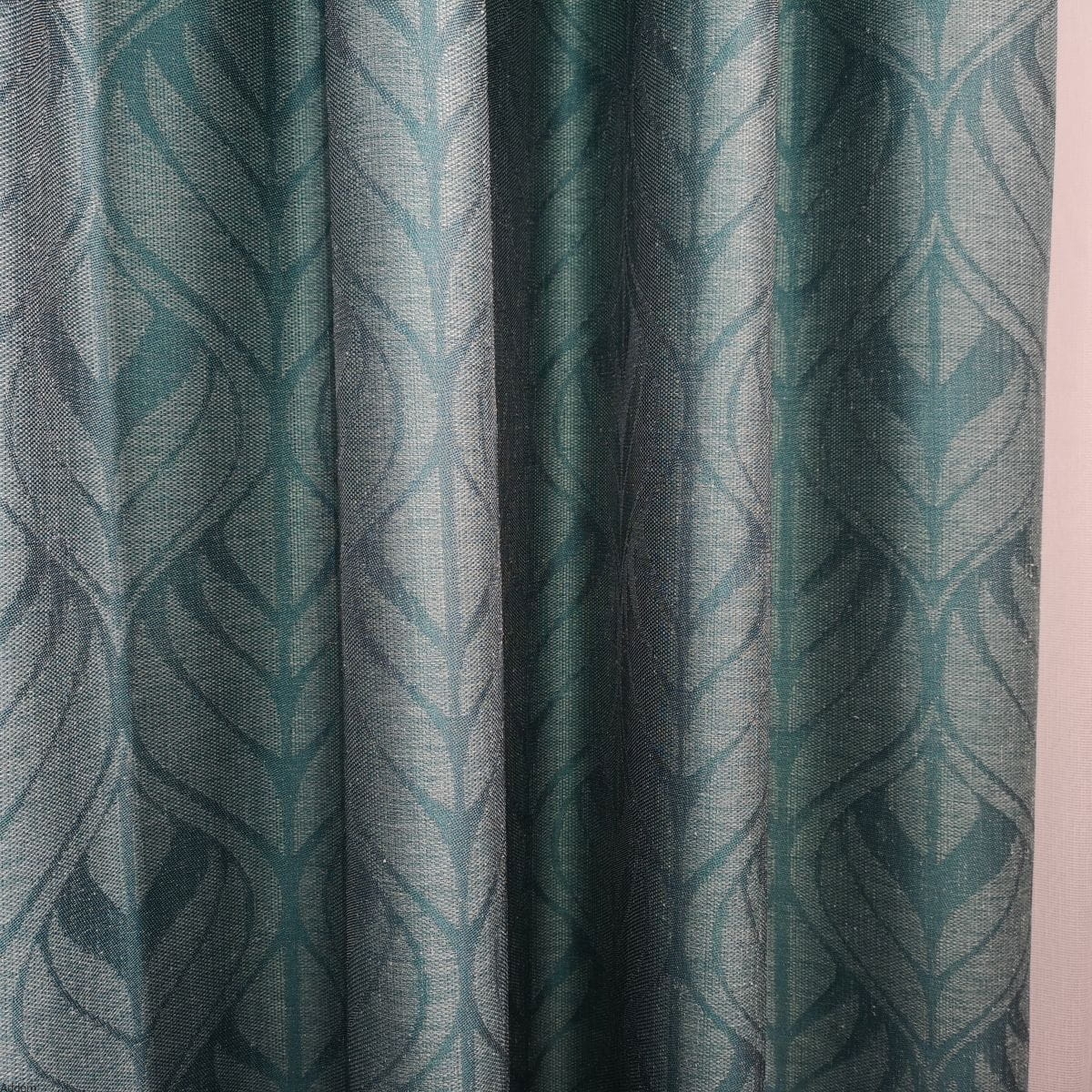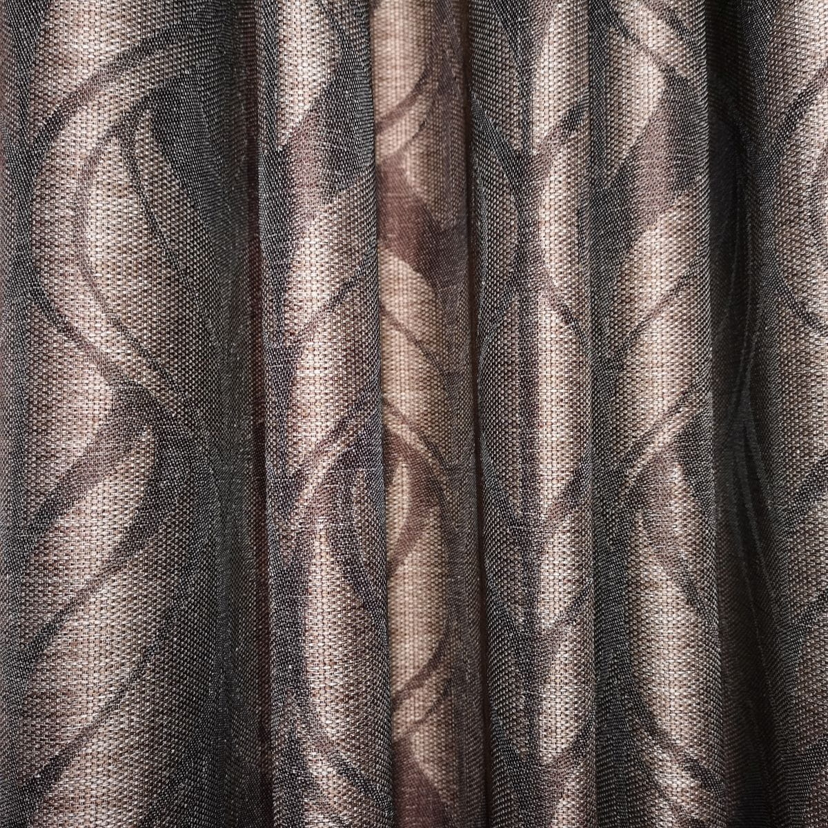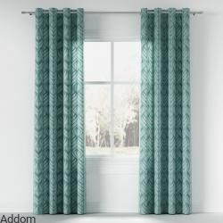 Gotowe zasłony zacieniające, na 8 przelotkach - kółkach do przekładania przez nie karnisza, w liście i kwiaty, na jednokolorowym tle. Wymiary użytkowe: wysokość 250 cm, szerokość 140 cm. Długość od brzegu do brzegu - 260 cm, jednak po zawieszeniu za pomocą przelotek zasłonki skracają swój wymiar na wymiar użytkowy 250 cm.