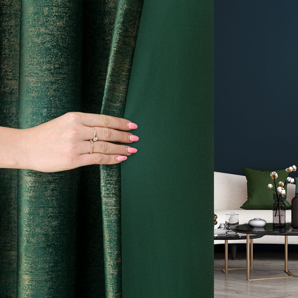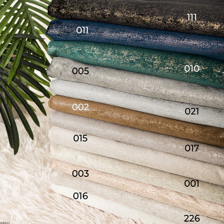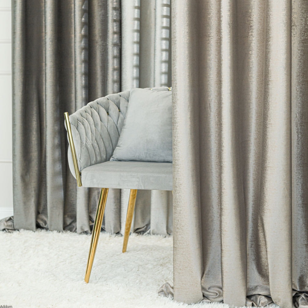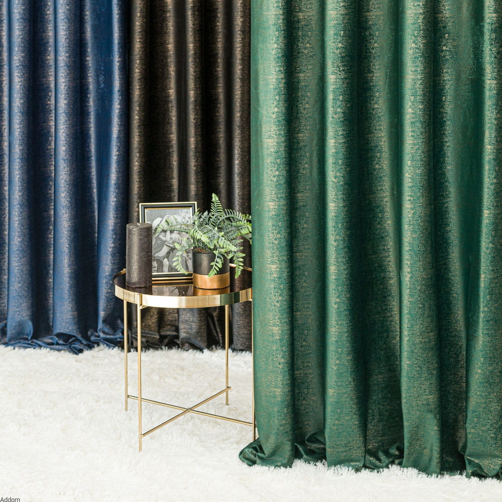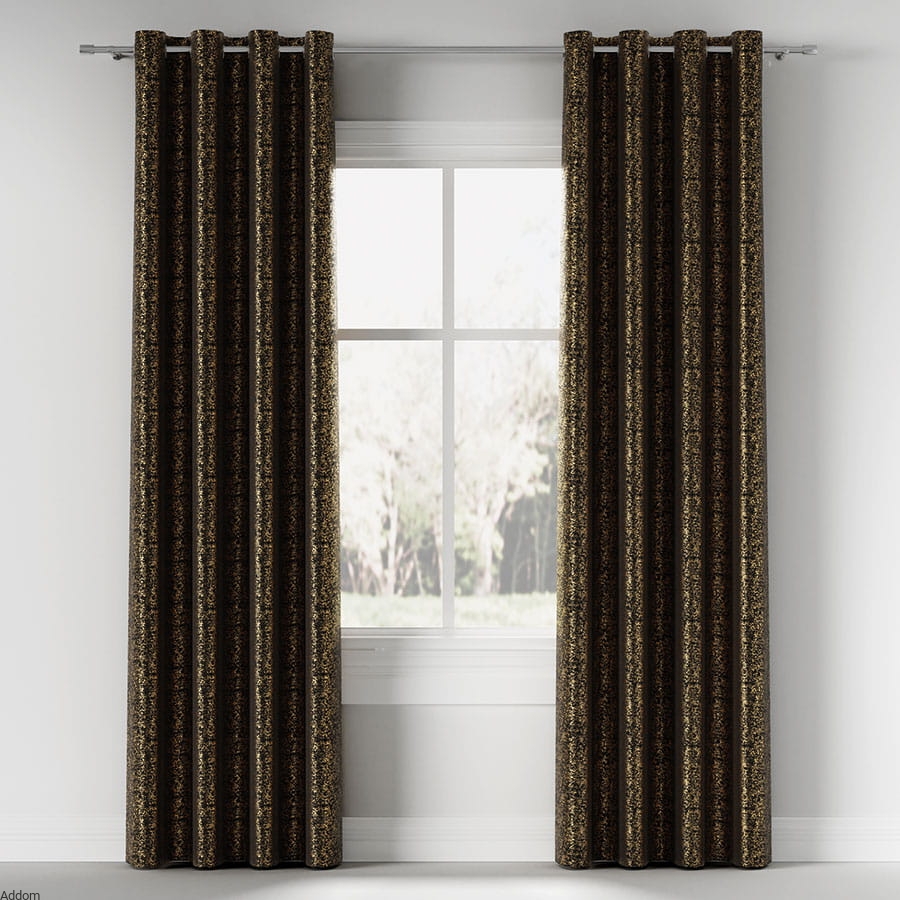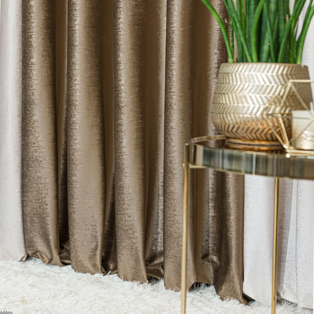 Zasłony ze złotym zdobieniem, z przelotkami lub taśmą o wielu możliwościach zawieszenia ich, sprzedawane na sztuki. Story o matowym tle i błyszczącym, mocno złotym lub lekko złotawym, nakrapianym nadruku. Nadruk w formie nieregularnych kropeczek jak rozpryskanych czy pociągniętych pędzlem jest gęsty i sprawia, że zasłony błyszczą na złoty kolor. Zasłony mają 150 cm szerokości, wysokość całkowita na jaką mogą być uszyte to maksymalnie 250 cm. Stosunkowo lekkie zasłony ale nie są przezroczyste, zacieniają i dobrze zasłaniają widok za oknem.