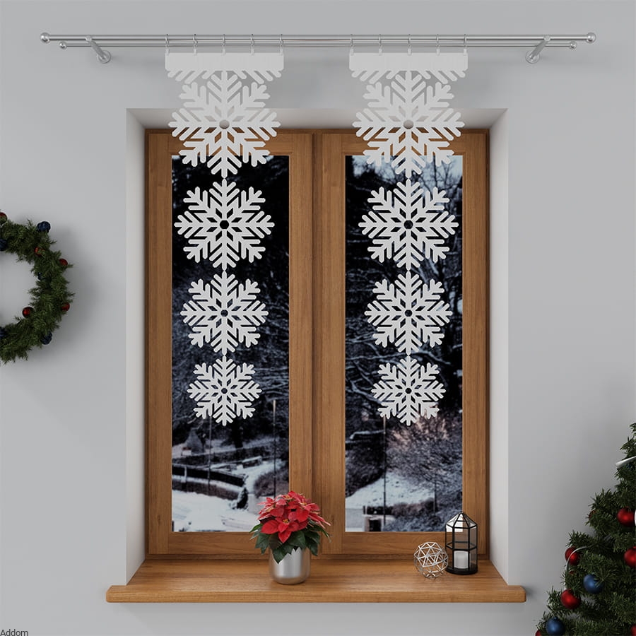 Wąskie, sztywne zawieszki wykonane jako panele żakardowe, wyglądające niczym wycinanka, w formie złączonych z sobą płatków śniegu. Śnieżynki żakardowe wychodzą od poziomej zawieszki, służącej do wczepiania ją w żabki, można im jednak doszyć rzep lub tunel. Wyglądają pięknie same w sobie, jako samodzielna dekoracja zimowa, mogą też dekorować okna razem z firanami, roletami i zasłonami, podkreślając zimowy charakter dekoracji. Krótsze zawieszki mają 4 śnieżynki, dłuższe 5 płatków śniegu. Można je samodzielnie skracać, odcinając śnieżynki, a odcięta śnieżynka może być niezależną serwetką na stół. Posiadamy też bieżniki w formie śnieżek.