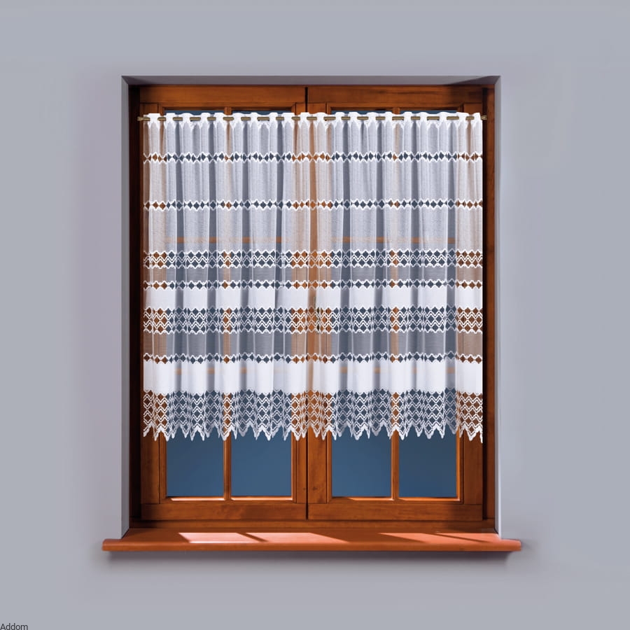 Firanki te są grą nici - na całości tworzy ona materiał przypominający tkaninę różnej grubości, w innych miejscach tworzy grubą obwódkę dla ażurowego w wzoru, w innych z kolei tylko biegnie w formie pojedynczych nici, aby wypełniając ażur być maksymalnie niewidoczną. Ponieważ oferujemy też takie firanki na metry, zazdrostka ta może służyć jako lambrekin lub dodatek do zasłon współgrających z firanami o tym samym motywie dekoracyjnym.