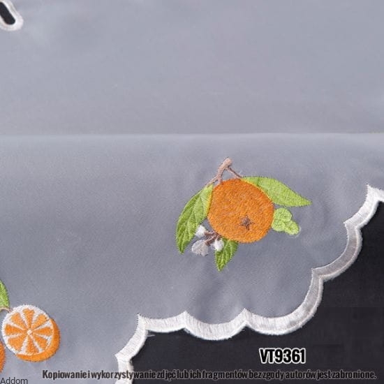 Zazdrostki z woalu, w haftowane cytrusy, pomarańcze, w których użyto 3 kolorów nici - pomarańczowej do owoców, białej do kwiatów pomarańczy oraz obhaftowania brzegów i otworów na karnisz, i zielonej do listeczków. Dół haftowany w formie fali. Zazdrostki kuchenne ze względu na owocki, kolor pomarańczowy nie tylko zdobi, ale wpływa pozytywnie na wydzielanie soków trawiennych, więc jest polecany w kuchni.