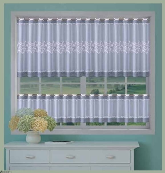 Zazdrostki żakardowe, mające górę i dół wykończone grafitowymi paskami. W górnym pasie znajduje się rząd otworów na karnisz, pod nim umieszczono cieniutki rząd listeczków w kolorze białym. Niżej biegnie szeroko pas drobnych listeczków, wyglądających z daleka jak haftowane. Na dole znajduje się także grafitowy pas, również przylega do niego rządek listeczków. Wygląd ten dotyczy firan o wysokości 90 cm, na firanie wysokości 30 cm rząd listeczków środkowych nie mieści się, wysokość narzuca im inny wygląd - są to blisko siebie umieszczone pasy grafitowe jedynie na górnym i dolnym brzegu.