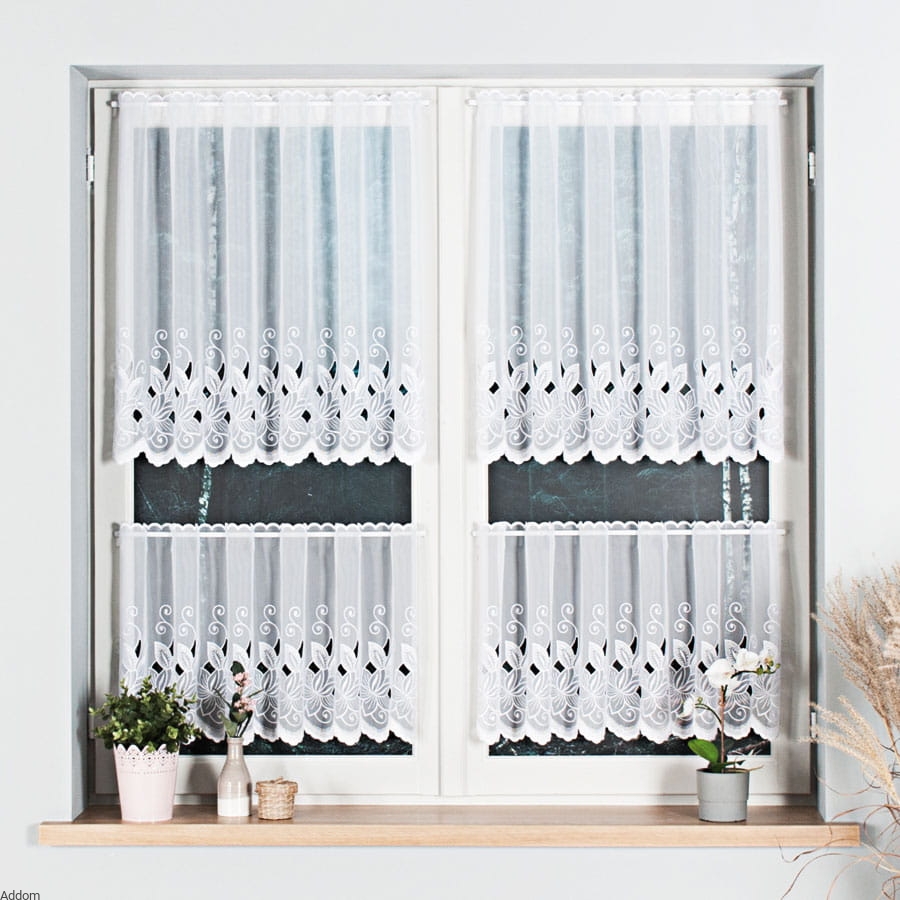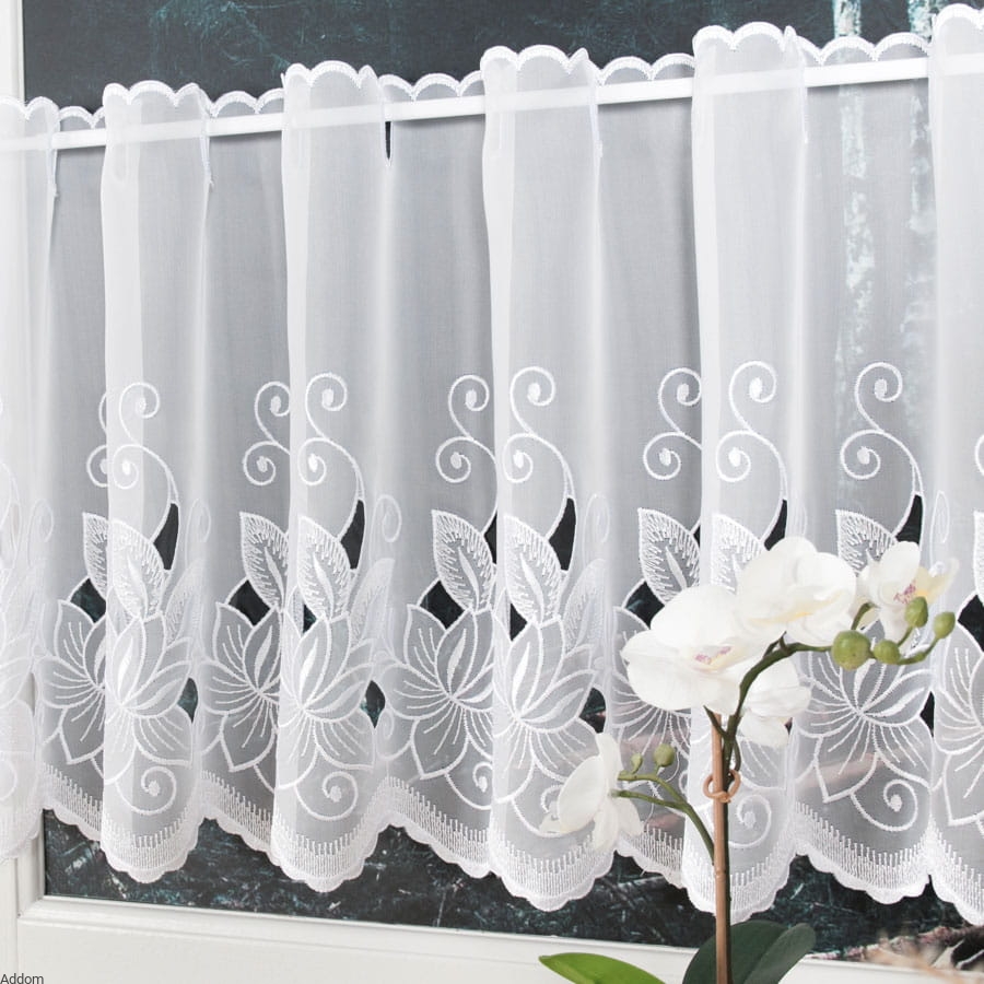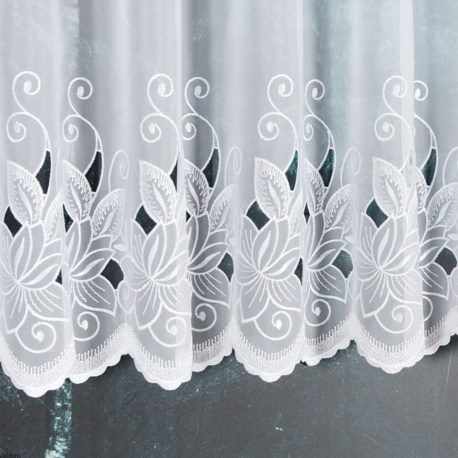 Zazdrostki tkaninowe z śnieżnego woalu, które udekorowano haftem Richelieu, który stanowią płatki od kwiatuszków dekorujących firanę. Płatki są obhaftowane szerokim szlakiem, między nimi są geometryczne, dekoracyjne dziurki w tkaninie. Góra z otworami na drążek oraz dół zostały wykończone haftem płaskim po obrysie. Są to dość kryjące krótkie firaneczki, więc przydadzą się wszędzie tam, gdzie chcemy naszą kuchnię chronić przed wzrokiem innych.