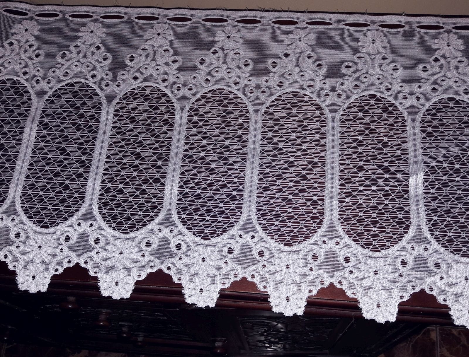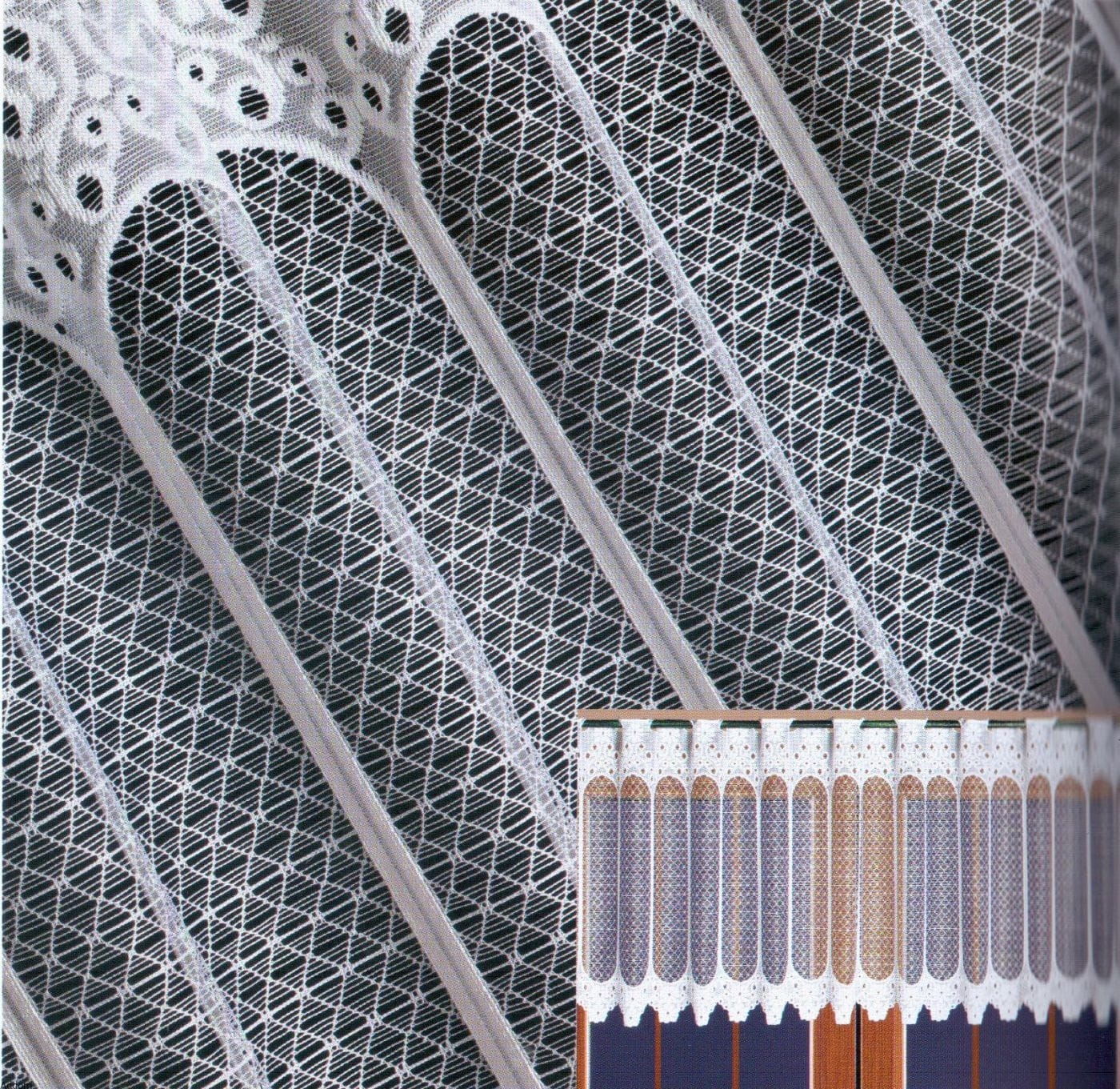 Stylowe, żakardowe, krótkie firanki od 35 do 90 cm wysokości, przypominające witraże wypełnione krateczką z rombów, w kształcie owalnych, pionowych prześwitów. Góra i dół są bardzo gęste, z delikatnymi wzorami kwiatowymi, wypukłymi po obwodzie, środki są natomiast ażurowe. Niesamowicie subtelne i eleganckie, do stylowych wnętrz.
