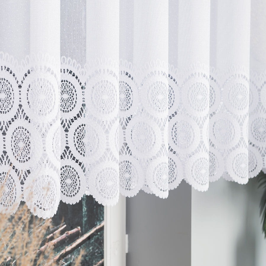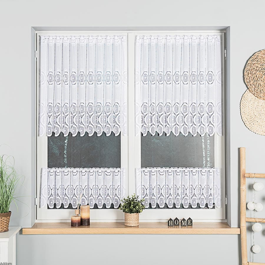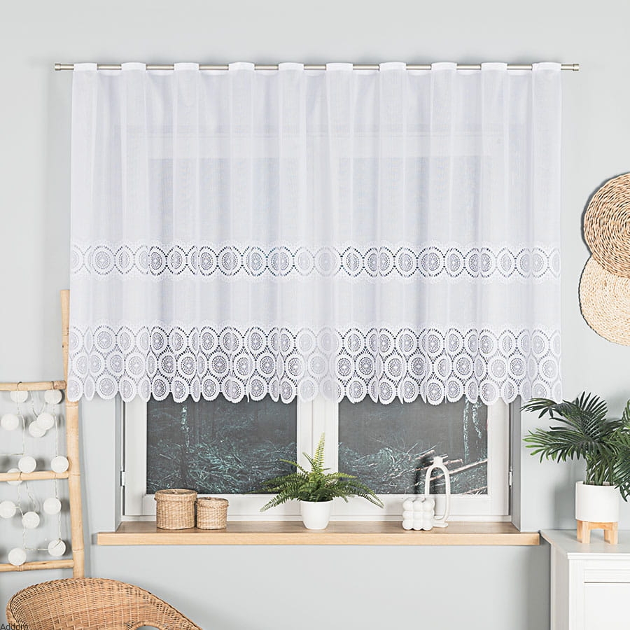 Firany zazdrostki z grubszego żakardu, z szlakiem szerokim w dole firanek, który tworzą koła. Zazdrostki ze zdjęcia są świetnym wyborem do kuchni, jadalni czy mniejszych pomieszczeń, gdzie większe firanki mogłyby być zbytnio przytłaczające. Krótka wysokość zapewnia funkcjonalność, wpuszczając dużą ilość promieni słonecznych, co sprawia, że wnętrze wydaje się przestronne i jaśniejsze. Żakardowa dzianina filtruje światło słoneczne, tworząc przyjemny nastrój, subtelnie zasłaniając widok zza okna.