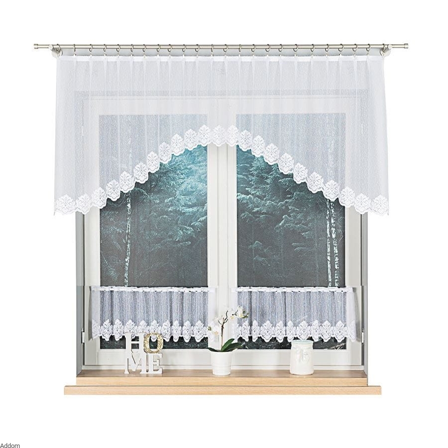 Zestaw żakardowych firanek do kuchni, w formie kompletu. Obie firanki wchodzące w skład zestawu są gotowe, uszyte, z wykończeniem górą w zależności od preferencji klienta - z taśmą marszczącą tradycyjną lub bez taśmy, oraz z taśmą multifunkcyjną z szelkami, która umożliwia 5 sposobów wieszania, w tym również na tunelu, natomiast dolna zazdrostka jest z otworami na karnisz. Dół to zazdrostka o wymiarach (szer x wys) 30x300 cm, góra to firana o wymiarach 80x250 lub 120x250 cm (przed zmarszczeniem).