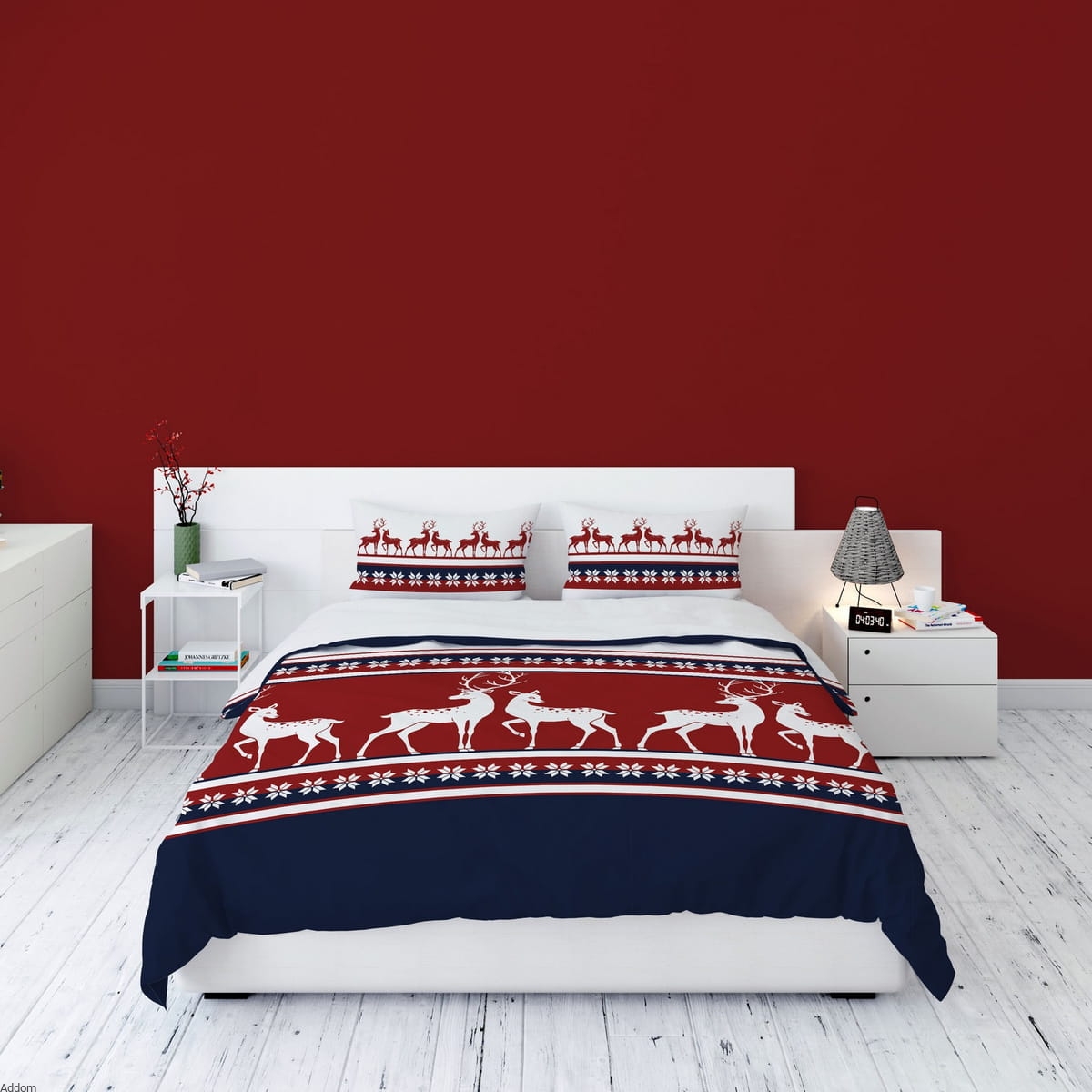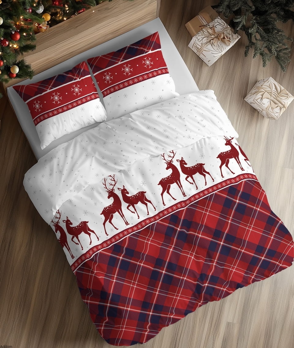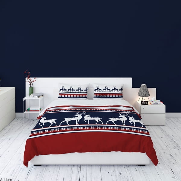 Zimowy komplet z meszkowatej flaneli bawełnianej, we wzory kojarzące się z atmosferą świąt, w jelenie czy też renifery, wyglądające jak ludowa wycinanka z granatowego tła. Dół pościeli to czerwona kratka, a poduszki 70x80 zdobi szlak z mniejszych reniferów. Idealny pomysł na praktyczny prezent świąteczny, nie tylko ze względu na grafikę zimową, ale także ze względu na gustowną formę opakowania. Tkanina z której uszyto komplet to flanela o gramaturze 160 gram, a zestaw zawiera do wyboru, poszwę 160x200 lub 200x220 cm. Forma zapięcia - zamki.