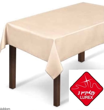 Obrusy z lurexu, srebrne lub złote, ze względu na błyszczącą, złotą i srebrną nić wplecioną w popielate lub musztardowe tło. Obrusy są plamoodporne, w kilku rozmiarach, warto zwrócić uwagę, że rozmiar 130x180 obecnie jest z 4 serwetkami w złotym albo srebrnym kolorze w komplecie, w zależności od wybranego koloru, natomiast rozmiary 120x160 i 140x250 są bez serwet.