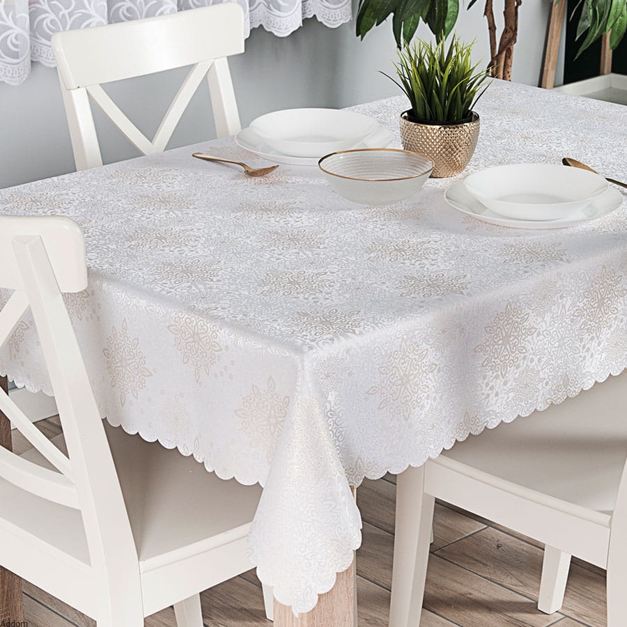 Obrus plamoodporny dwustronny, który można kłaść na stole którąkolwiek stroną - obie są piękne i użytkowe. Obrus są z jednej strony w kolorze błyszczącego złota i białe wzory płatków śniegu, mocno połyskujące i dobrze wyróżniające się ze złotego tła, natomiast druga strona jest biała, w złote wzory. Niektóre płatki śniegu są bez złotej nici, wyglądają jakby się rozpłynęły na obrusie zostawiając piękny ich kształt na tkaninie. Na tkaninie znajdują się mniejsze i większe gwiazdki. Brzegi obrusu są wytapiane a nie obszywane, dlatego obrusy te nie mają lewej strony, obie stroną są użytkowe.