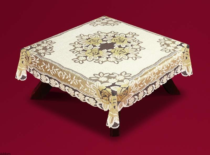 Stylowe obrusy z jaśniejszej, kremowej, oraz ciemniejszej, złotej przędzy, z wieńcem róż na środku, otaczającym ażur z oczkami o kształcie sześciokątnym, oraz różami w postaci bukietów na 4 rogach stołu.